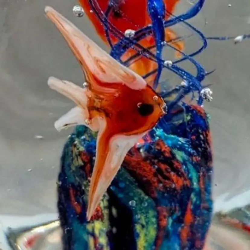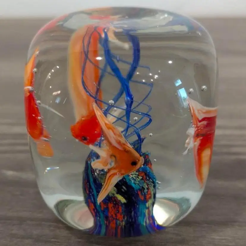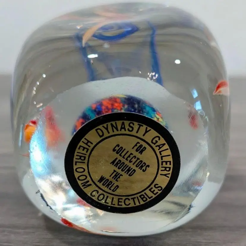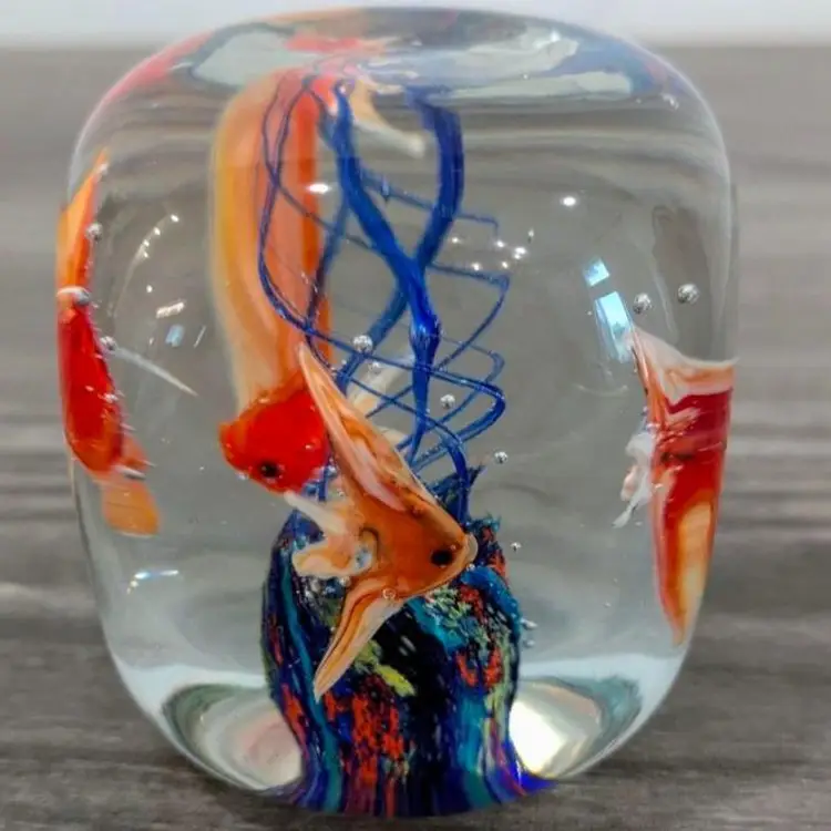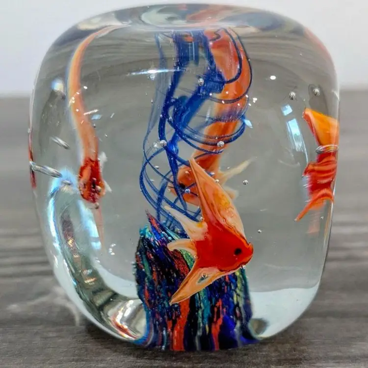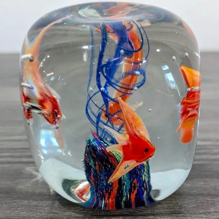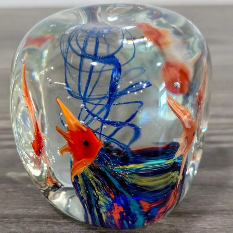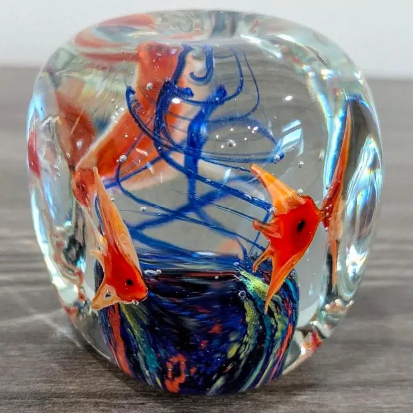 2.1/4" cubed with soft round edges, subtle concave dimples on each side, vibrant colors, crystal clear, More beautiful in person, 4 detailed glass fish, vintage, Dynasty Gallery sticker present, Dramatic fun Vintage Art Glass Paperweight!