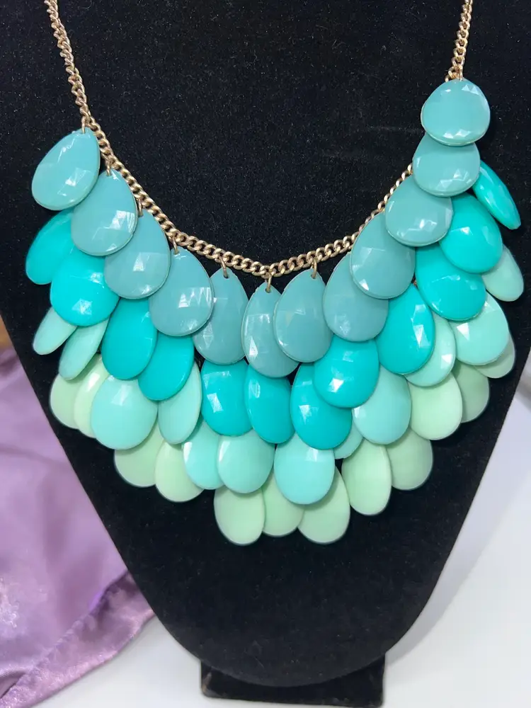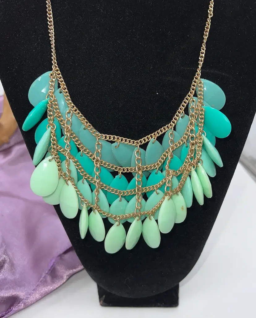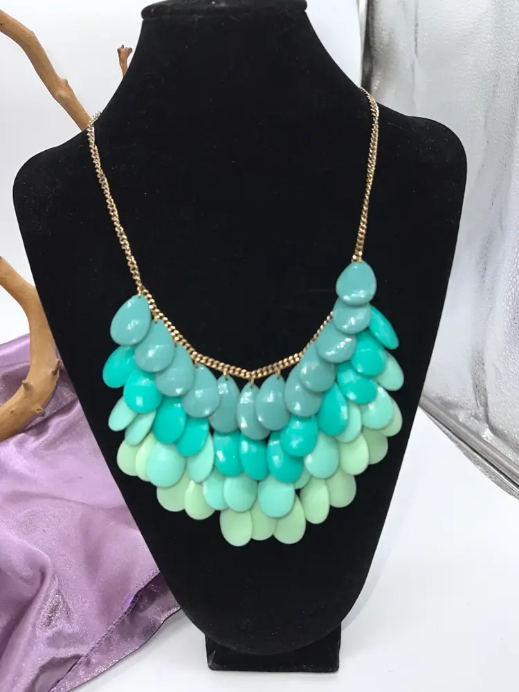 Gold tone layered bib necklace by Dinah. Ombré from mint to turquoise. 20”