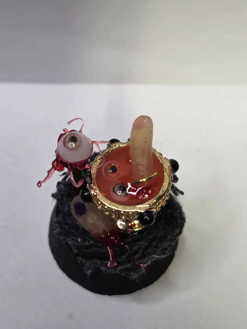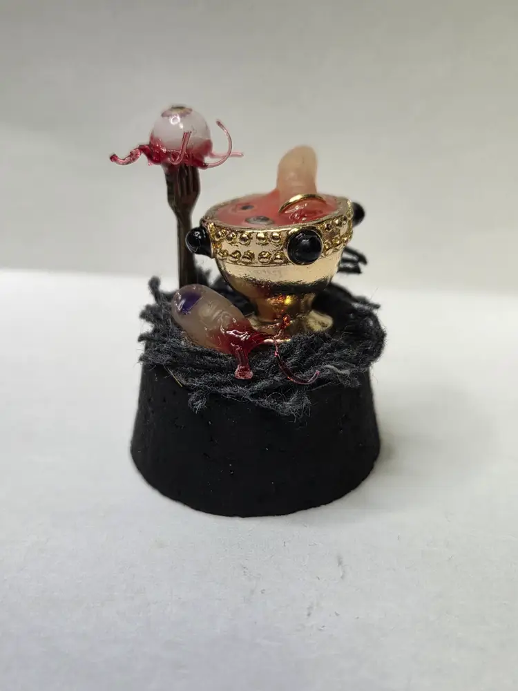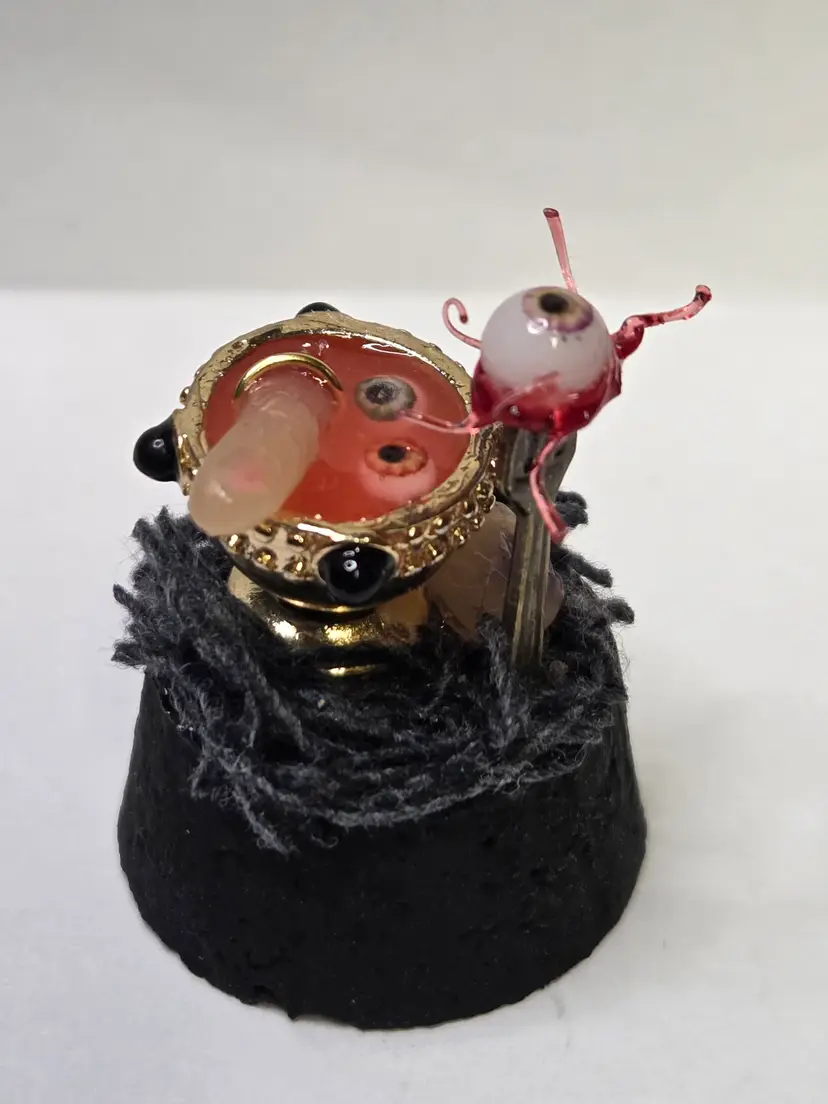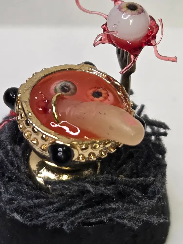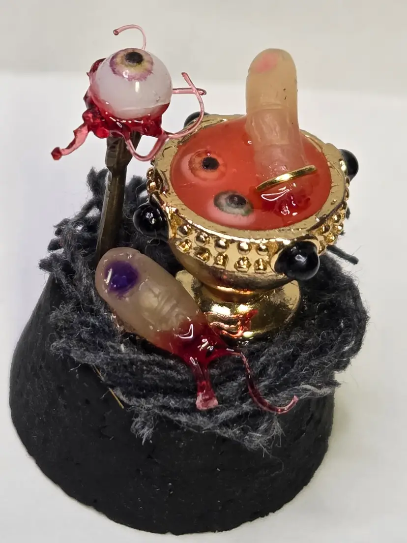 Who's hungry? This creepy cloche has a chalice that was perfectly upcycled from a necklace then filled with a glowing concoction of eyeball and digit soup. The finger is made from polymer clay and still has the ring attached. A thumb is waiting to be eaten and an eyeball with all the ligaments attached is on a fork...yum!