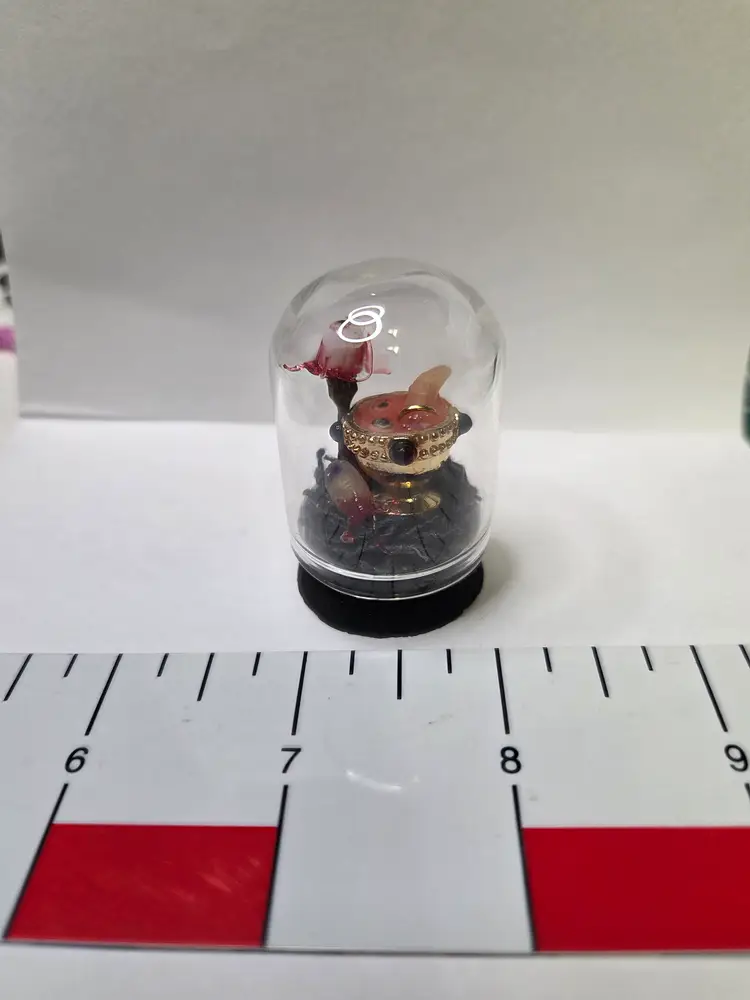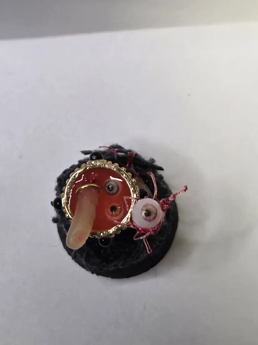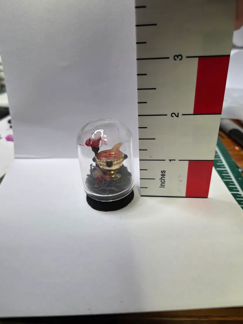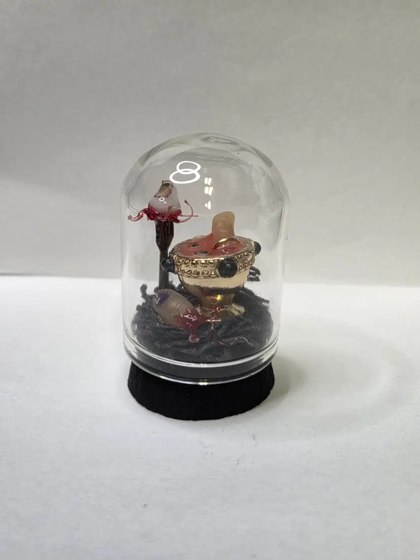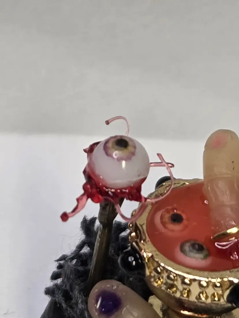 Who's hungry? This creepy cloche has a chalice that was perfectly upcycled from a necklace then filled with a glowing concoction of eyeball and digit soup. The finger is made from polymer clay and still has the ring attached. A thumb is waiting to be eaten and an eyeball with all the ligaments attached is on a fork...yum!
