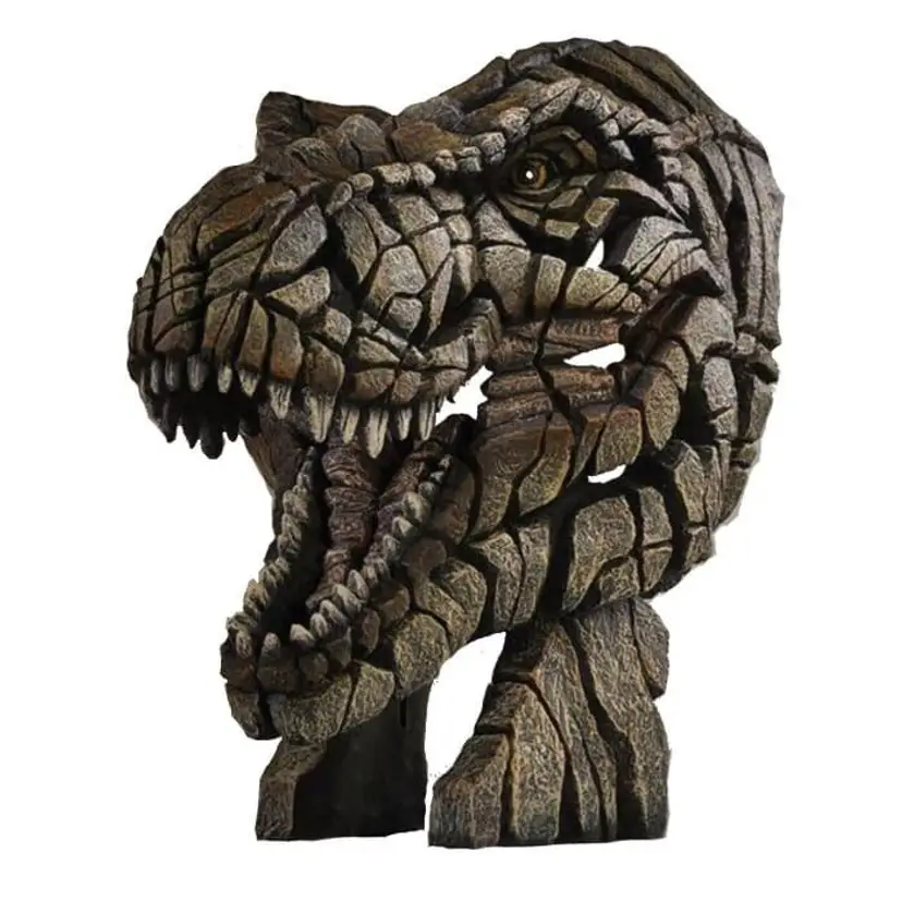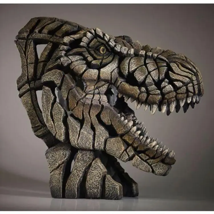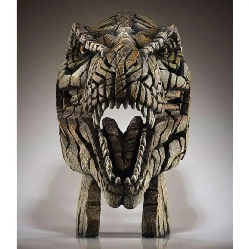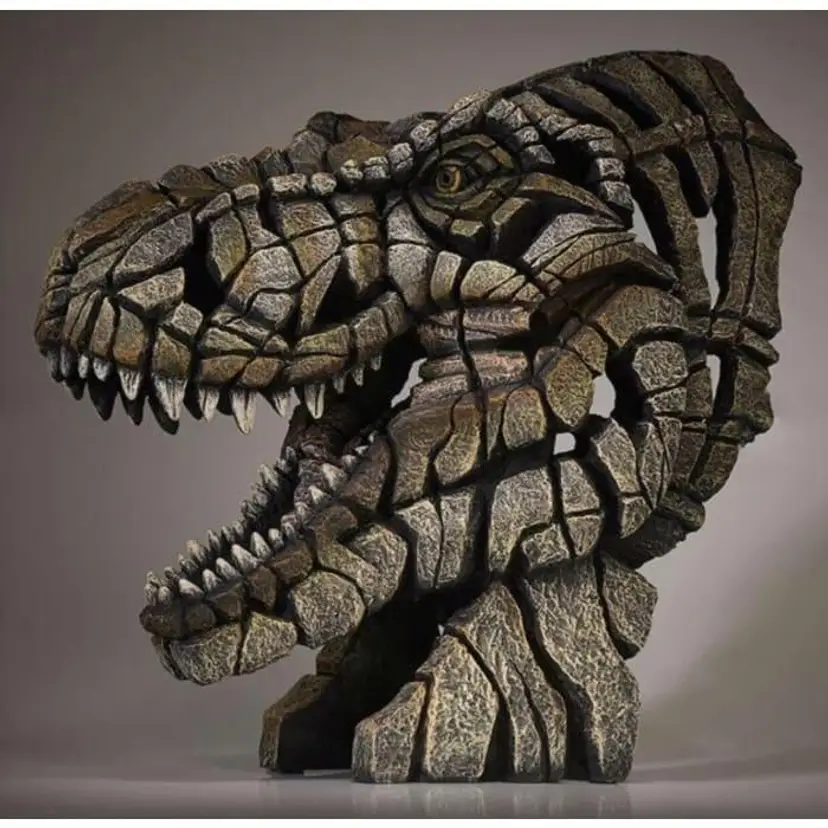 Dinosaur T-Rex Bust Edge Sculpture. During the Cretaceous Era, the plains and forests of North America were stalked by the most formidable predator ever to walk the Earth, the tyrannosaurus rex. The indomitable ferocity of the t-rex's face with jaws agape can be yours with this sculpture. 24-25-18 117-72shp This is for 1 T-Rex Bust Edge Sculpture Figurine 19.69 in H Colors: Green, White and Brown Exquisitely hand painted & handcrafted in stone resin For indoor use only 19.75 IN H x 12.25 IN L x 20.75 IN W Edge Sculpture® Ltd. 2019