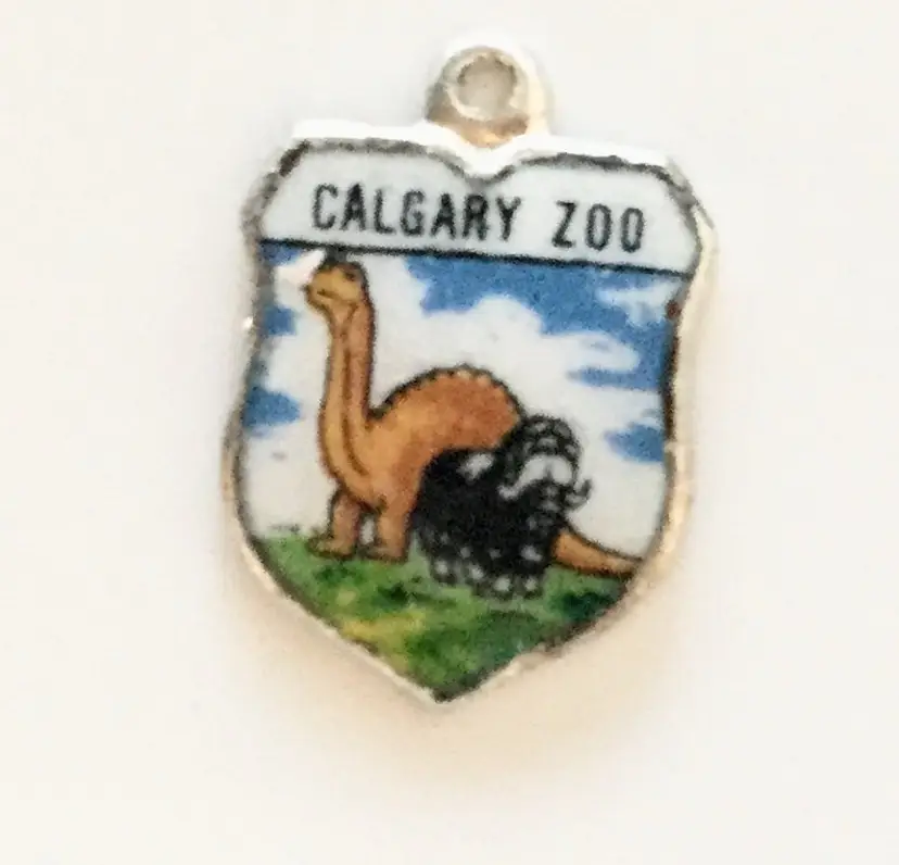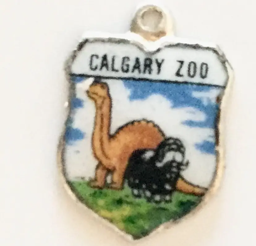 Dinosaur Calgary Zoo - Vintage Enamel Souvenir Travel Shield Bracelet Charm - Silver Plated