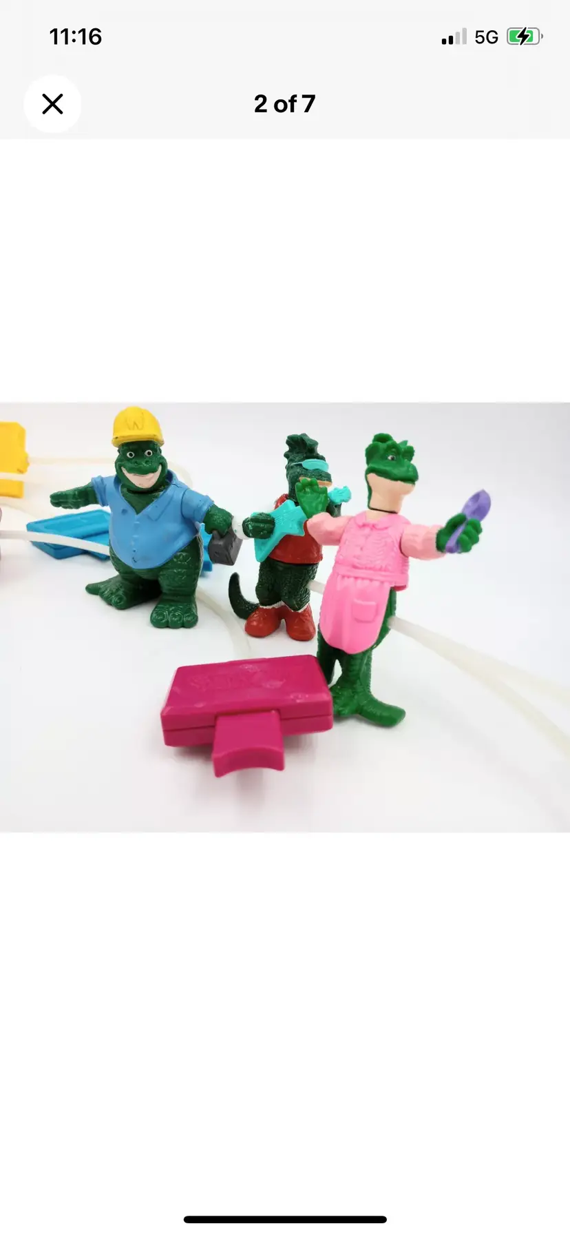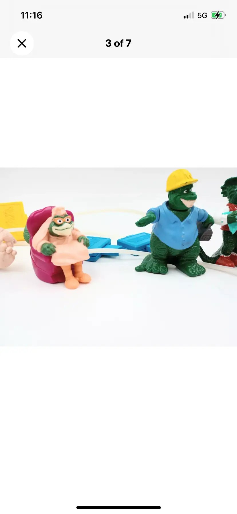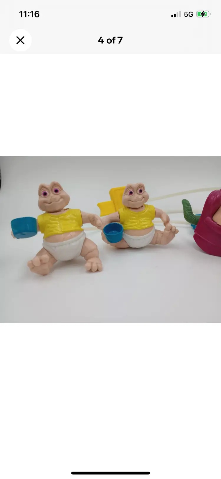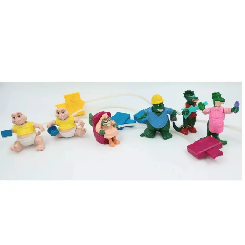 Vintage Disney TV Show Dinosaurs Sinclair's Family figures which all are attached to tube and button to make them movable. Lot of 6, 2 being the same. Earl, the father: Fran, the mother: Robbie, the son: Baby Sinclair (2) and Fran's mother Ethel. All are in good shape, no problems with paint, and all removable when buttons are pushed. Will answer any questions. See all pictures