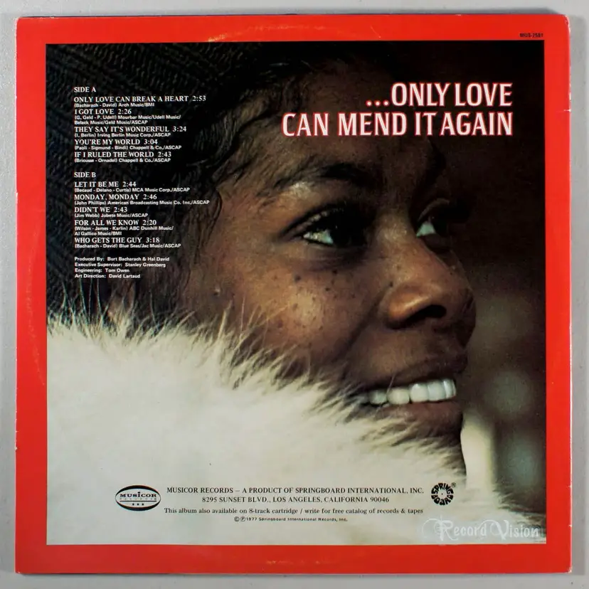 Unlike other re-packagers who mined the bankrupt Scepter Records catalog for Dionne Warwick hits collections, Musicor Records assembled a compilation in 1977 that consisted of relatively obscure Warwick Scepter recordings, stray LP tracks on which she covered songs like the Mamas & the Papas' Monday, Monday and Richard Harris' Jimmy Webb-composed Didn't We. If you didn't look carefully, you might easily suppose that Only Love Can Break a Heart was a new Warwick album, not a selection of old recordings dating well back into the 1960s, and probably that was the idea. Musicor released a single of the title song, written by Warwick mentors Burt Bacharach and Hal David, and a hit in 1962 for Gene Pitney, and it saw some action on the adult contemporary charts and the LP spent almost two months in the lower reaches of the album charts. She also sings sing show tune standards like Irving Berlin's They Say It's Wonderful from Annie Get Your Gun and If I Ruled the World from Pickwick.