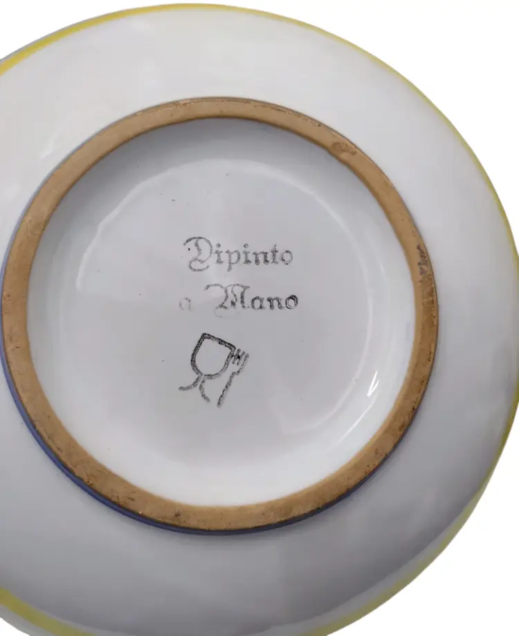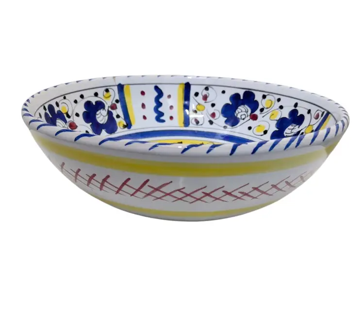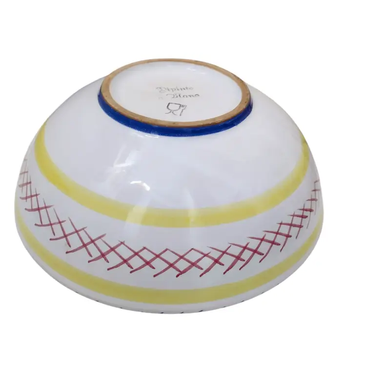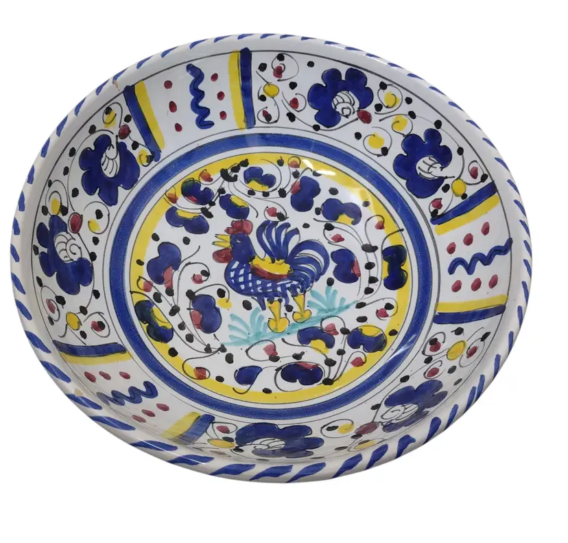This is a very nice handpainted Italian bowl with a floral & rooster/chicken design. This is a great size for serving veggies, potatoes & so much more. Bowl measures 8" wide x 3" tall.