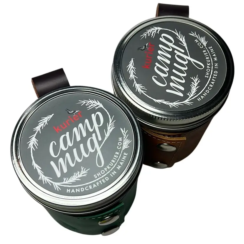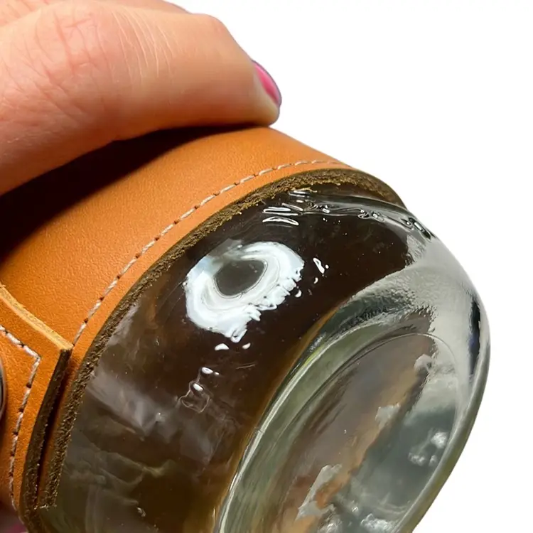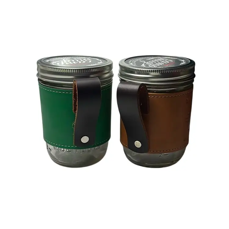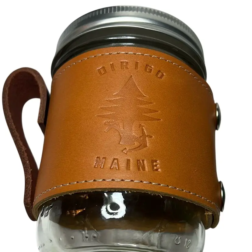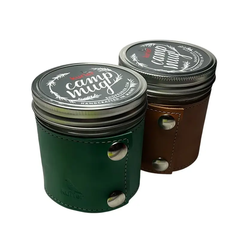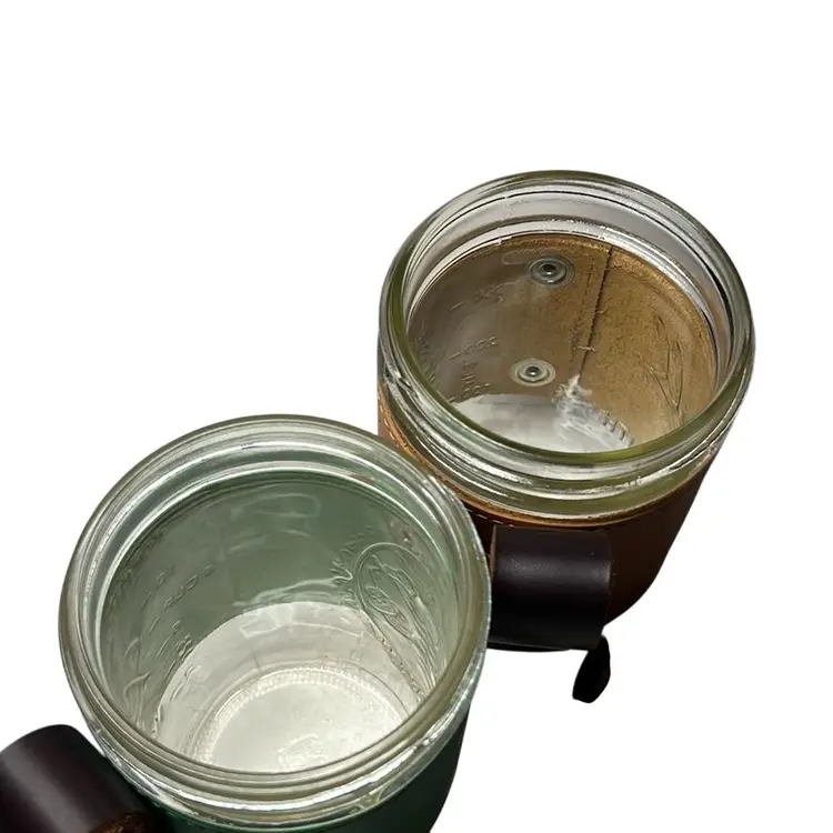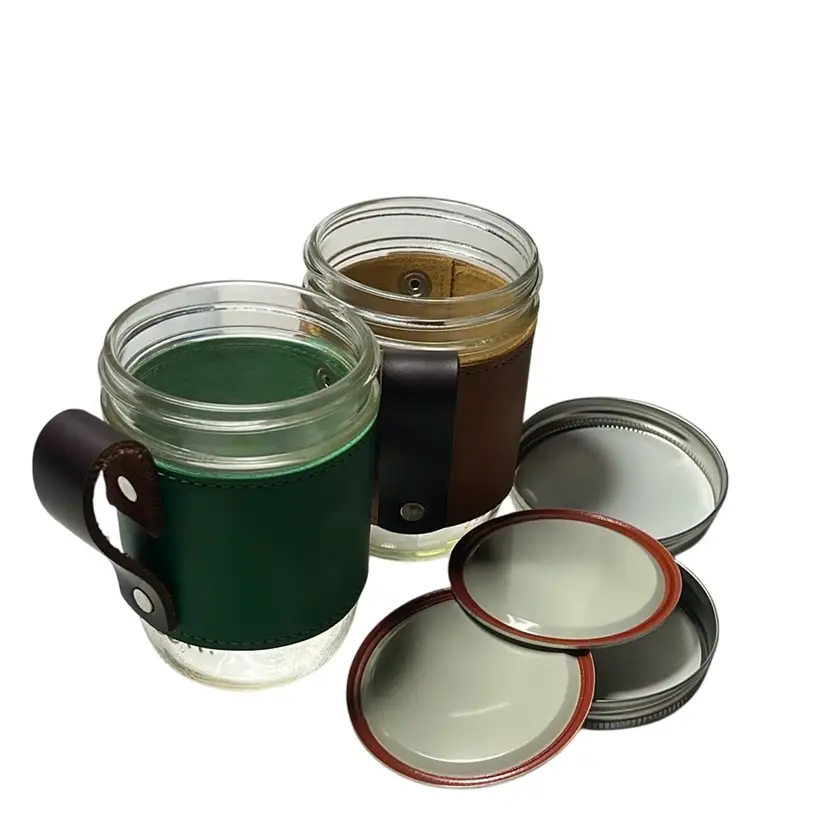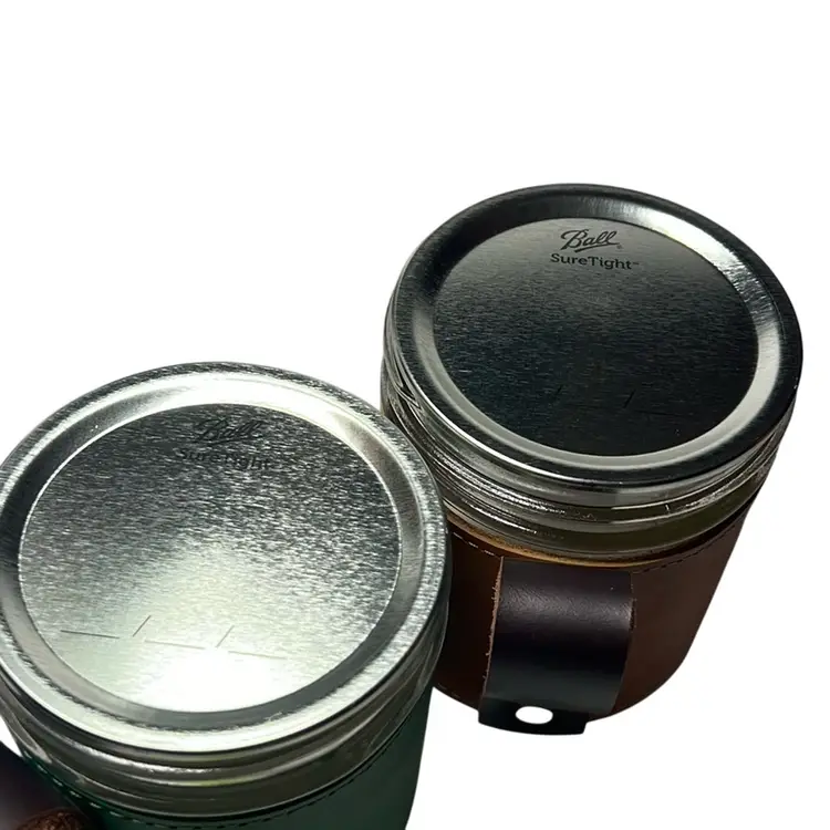 Both are ball jars, have measurements on side and sure lock seals. Leather is vegetable tanned leather. Leather handles on each mug. Perfect for camping or traveling. No damage Measures 5” tall & 3.75” wide and holds 16 oz’s