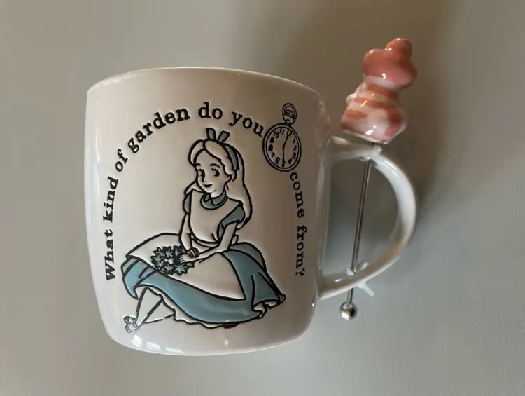 Disney Alice In Wonderland Mug With Cheshire Cat Stirrer Zrike Brands. Like new condition. Stirrer still attached. Comes as seen in pictures.