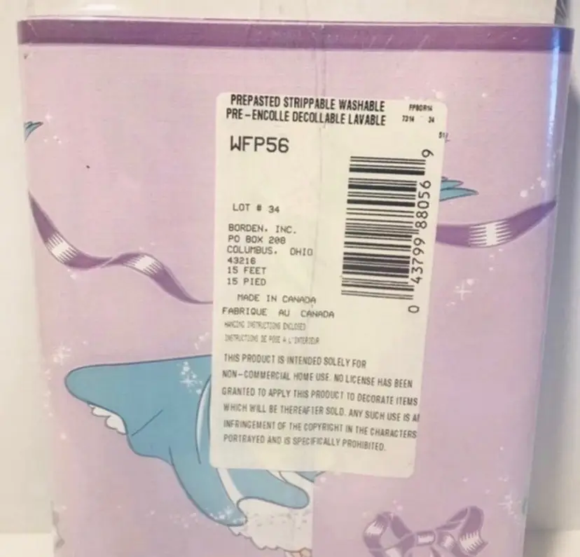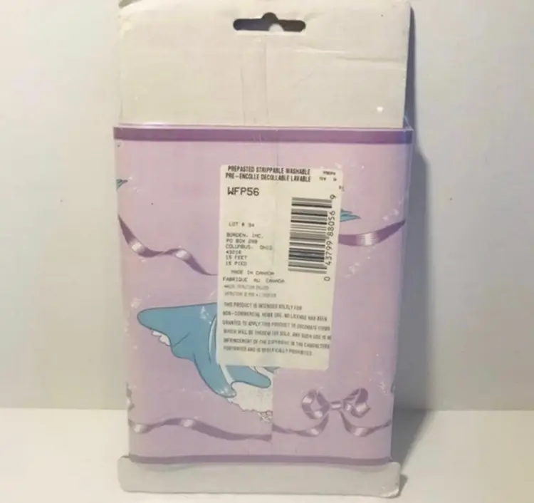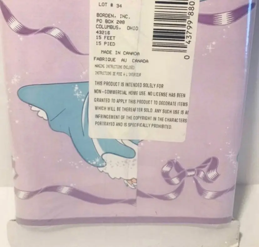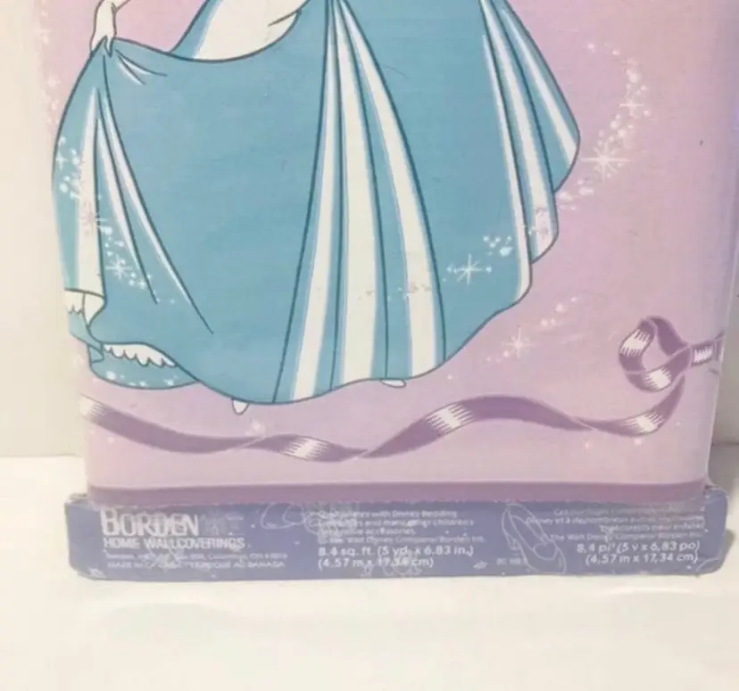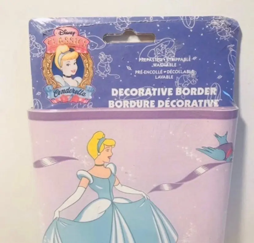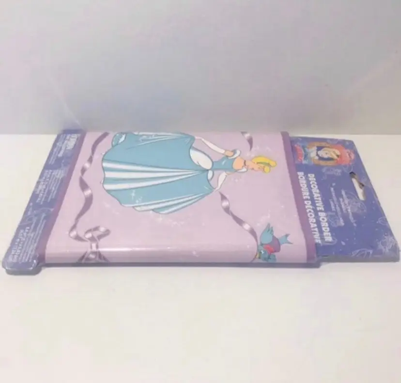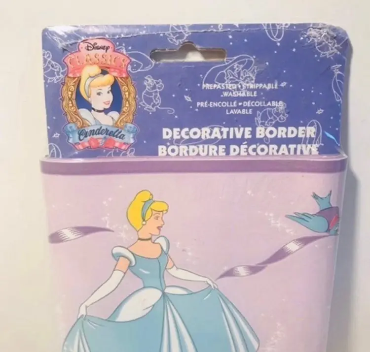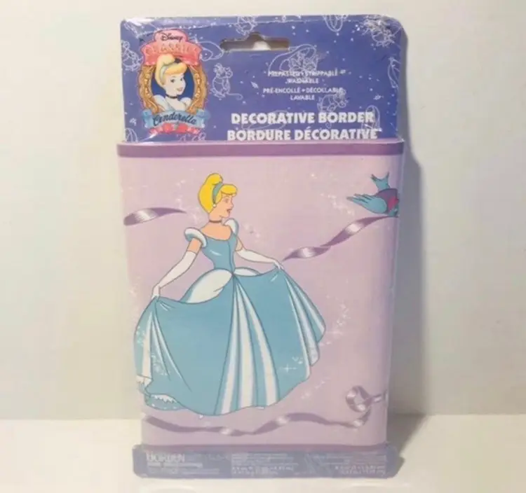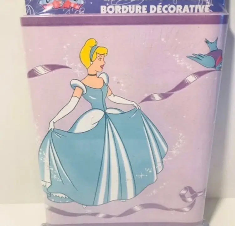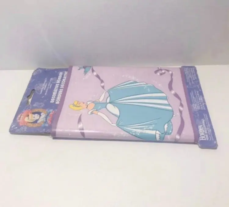 Disney Borden home wallcoverings Cinderella decorative border New in package Background is purple, Cinderella is wearing a blue dress 8.4 sq. Ft.