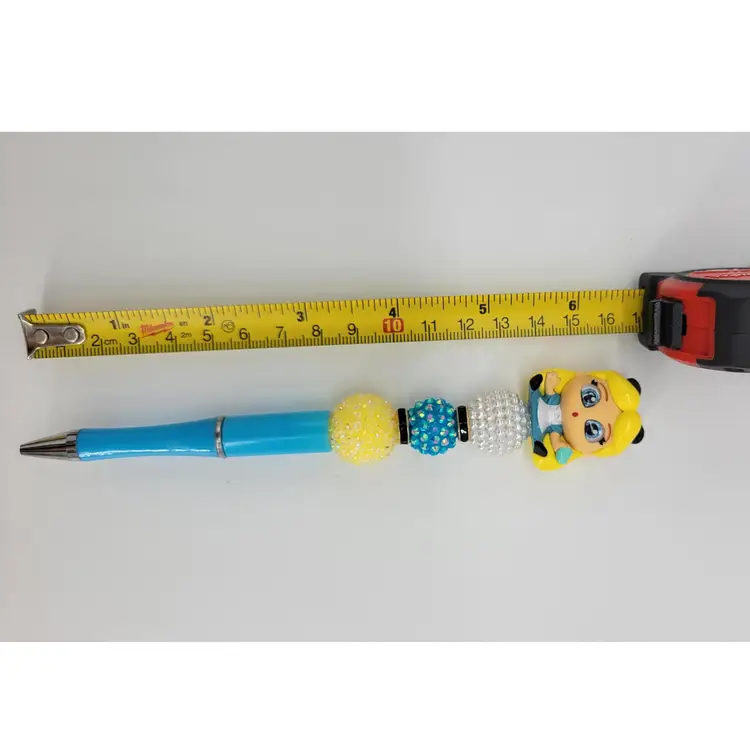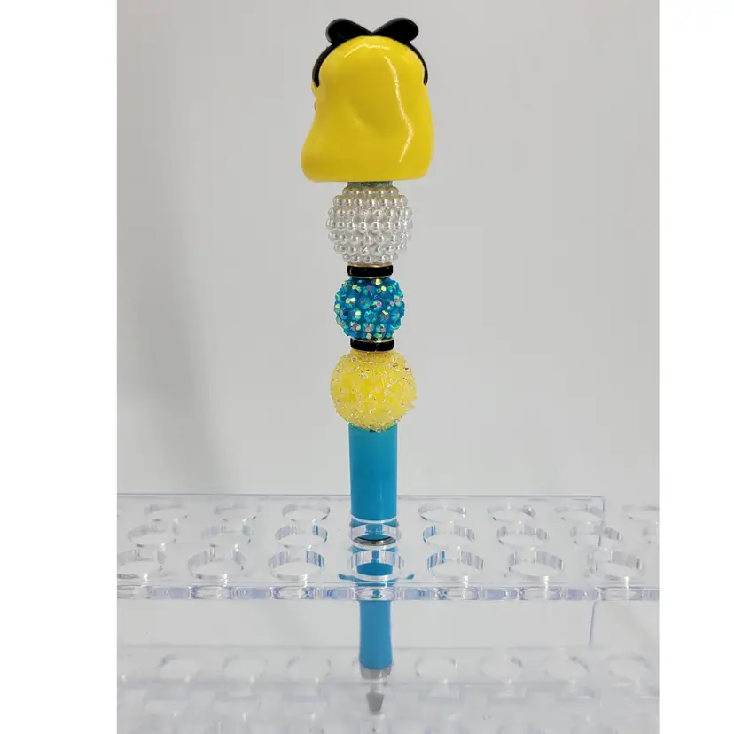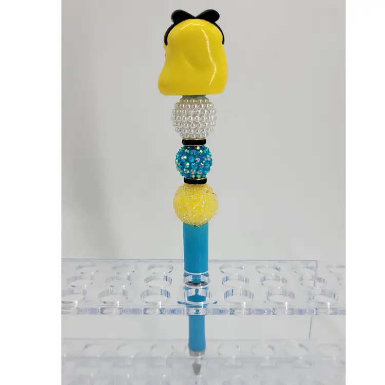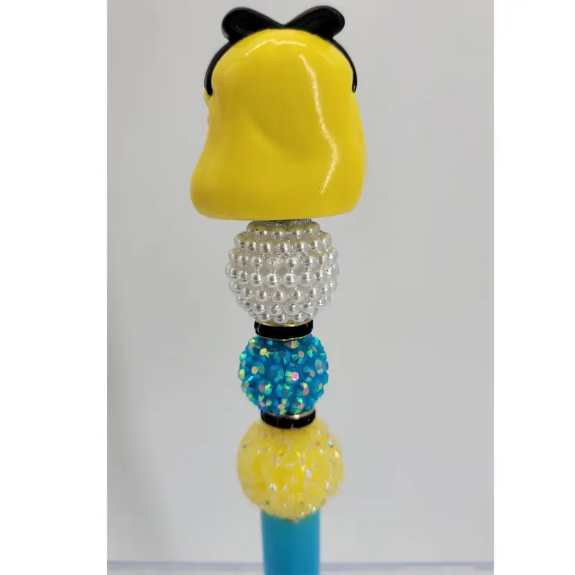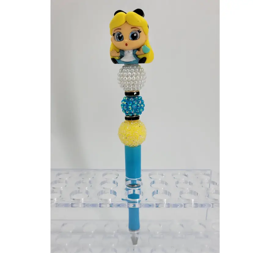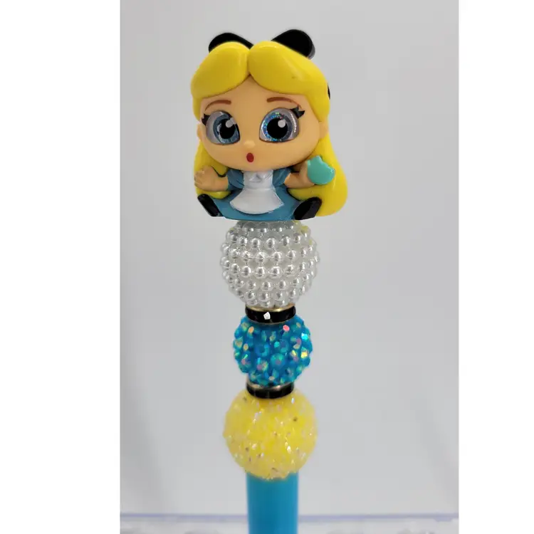 Beadable ink pen topped with a Disney Doorables mini figure of Alice. Pen is blue. Pearl white, blue, yellow and black beads. Pen comes with black ink ready to go and one refill. Approx 6.75"