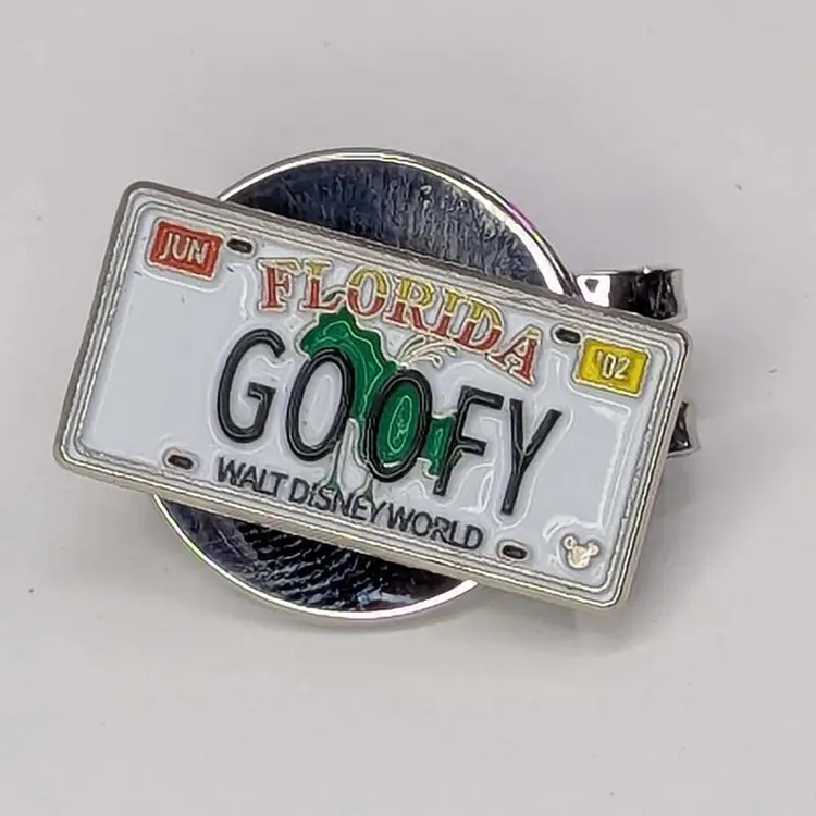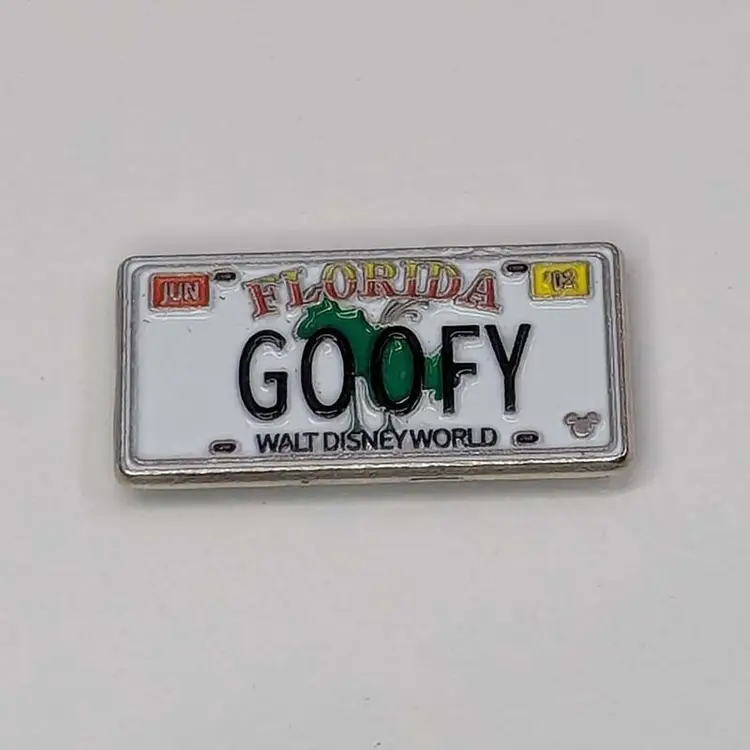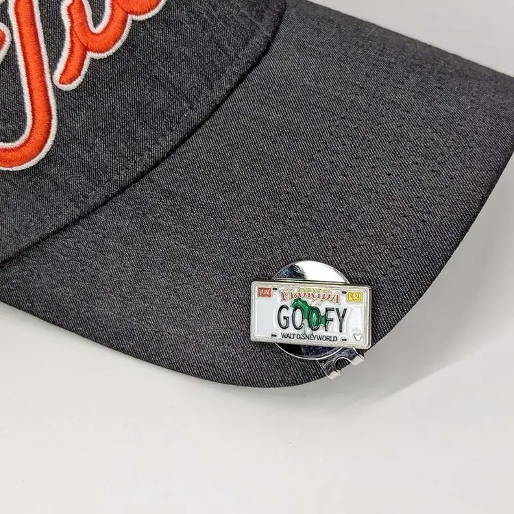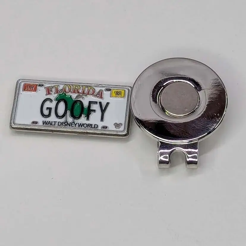 The Disney "Goofy" License Plate Golf Ball Marker with Magnetic Hat Clip features a multicolor design with Goofy character graphics. Made of metal, this set includes magnetic for easy attachment to a hat clip. Perfect for Disney and golf enthusiasts.