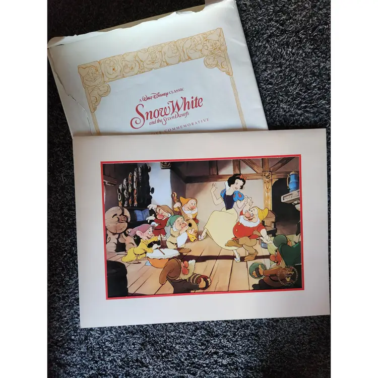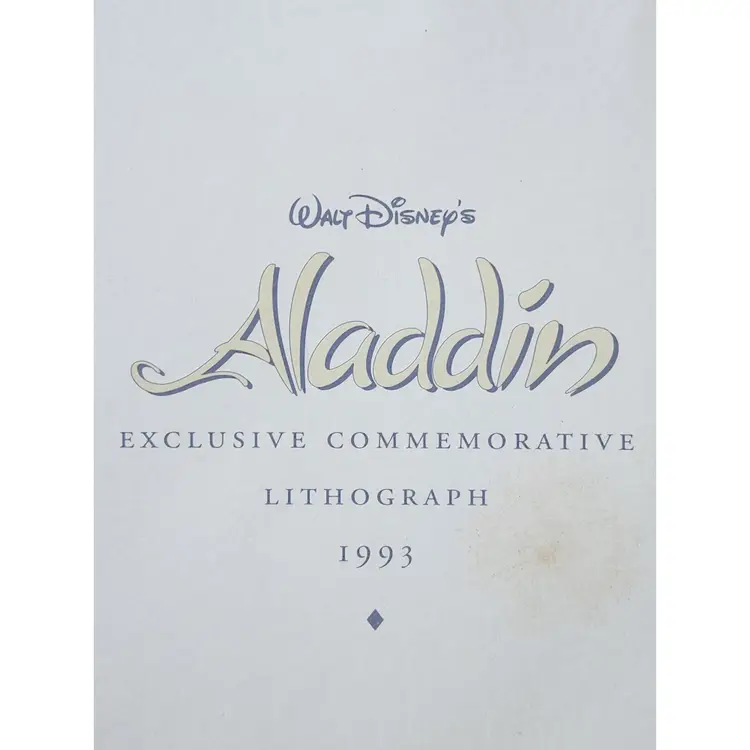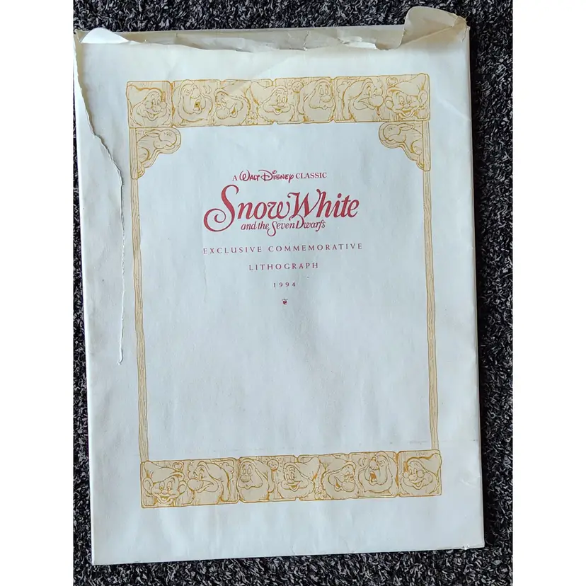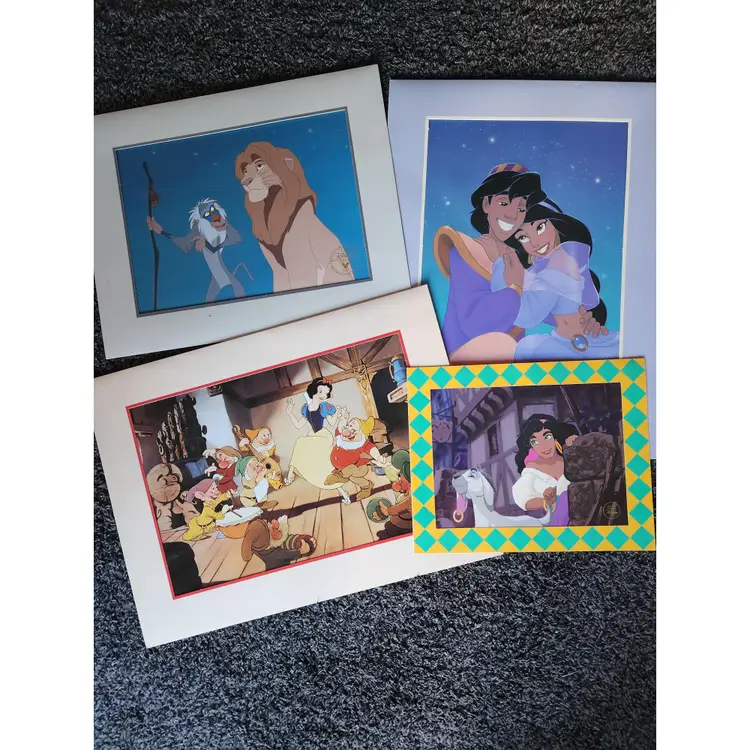 Disney Lithographs Set of 4 Aladdin - 1993 - Measures 12 x 16 inches - Features Aladdin and Jasmine The Hunchback of Notre Dame - 1996 - Measures 10 X 8 Inches - Features Esmeralda and Djali The Lion King - 1995 - Measures 14 x 11 inches - Features Simba and Rafiki - Has original envelope(damage) SnowWhite & 7 Dwarfs - 1994 - Measures 16 x 12 inches - Features SnowWhite & 7 Dwarfs - Has original envelope (damaged)