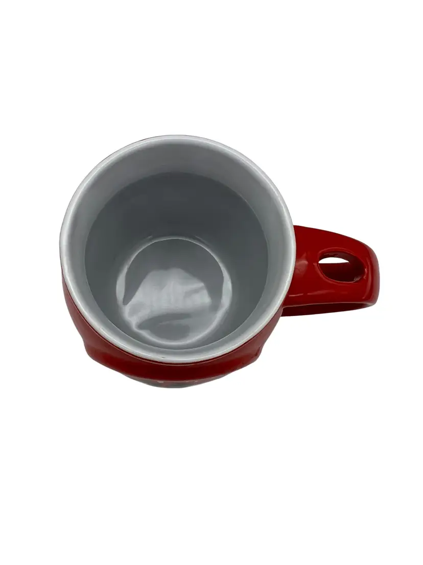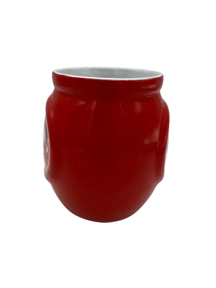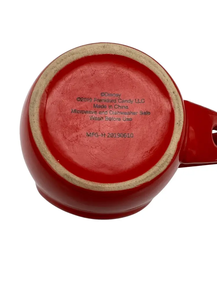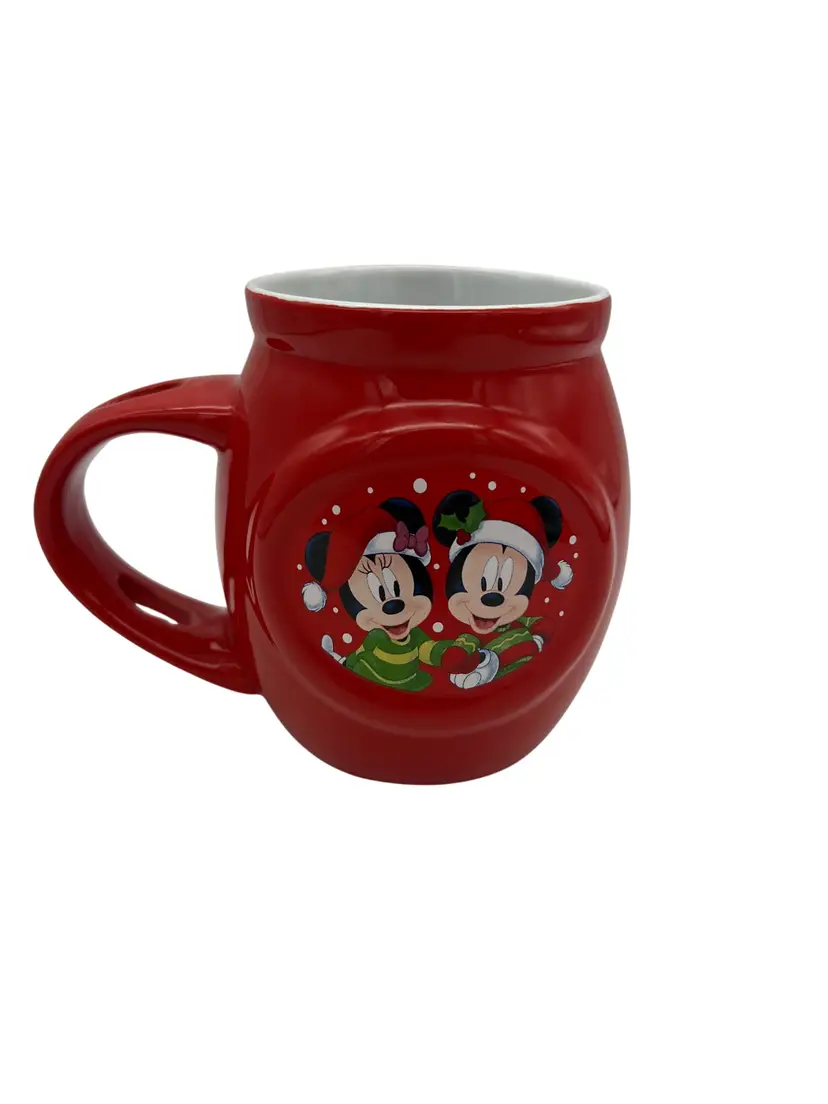 Festive Disney ceramic holiday mug featuring Mickey and Minnie Mouse in cheerful Christmas attire, complete with Santa hats and scarves. This bold red mug was produced in 2019 by Frankford Candy LLC and is both microwave and dishwasher safe. Measures approximately 4.5" tall and is perfect for sipping cocoa, coffee, or tea during the holidays. A great gift for Disney fans or a cute addition to any Christmas mug collection.