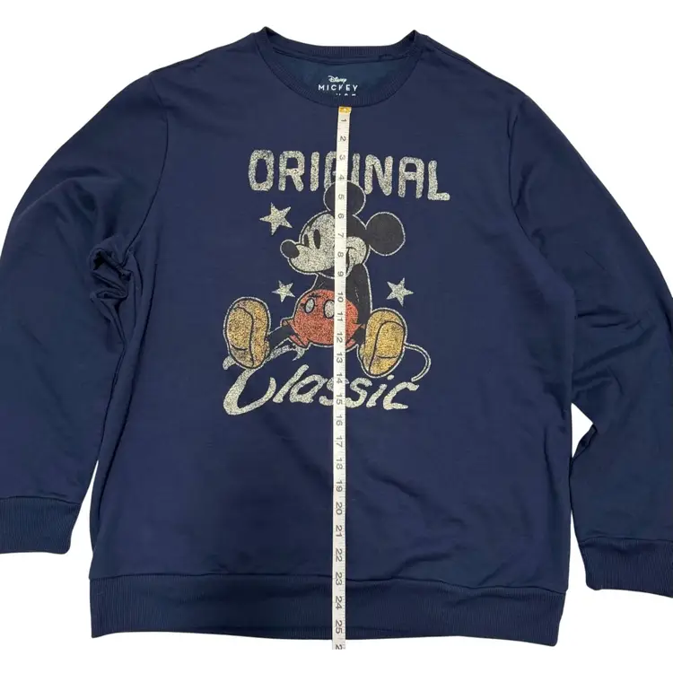 The Disney Mickey Mouse Classic Navy Blue Crewneck Sweater by Disney Store in XL size is a unisex adults' pullover sweater featuring the iconic Mickey Mouse character. This navy blue sweater with a crew neck design is perfect for fans of Disney and classic Mickey Mouse theme. The sweater is made by Disney Store, ensuring quality and authenticity in the design and branding. Perfect for those looking to add a touch of nostalgia and fun to their wardrobe.