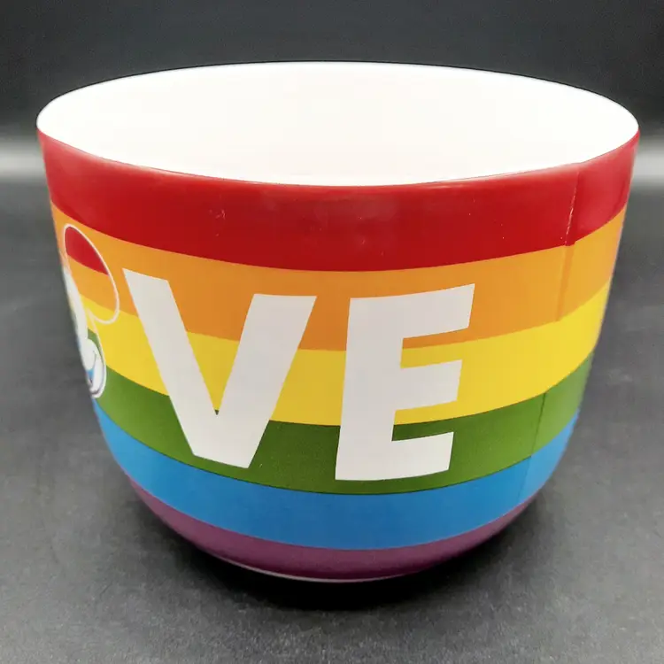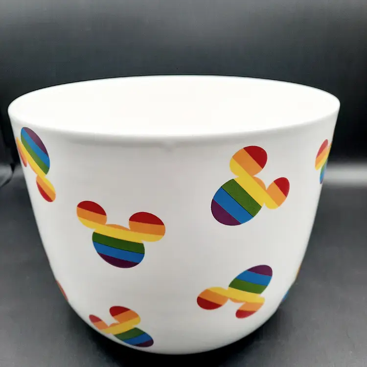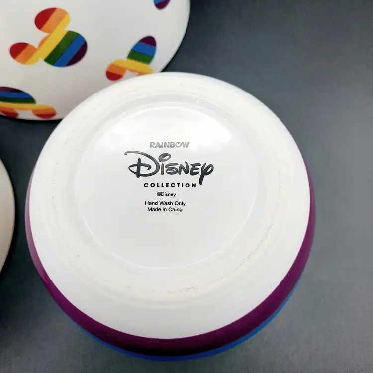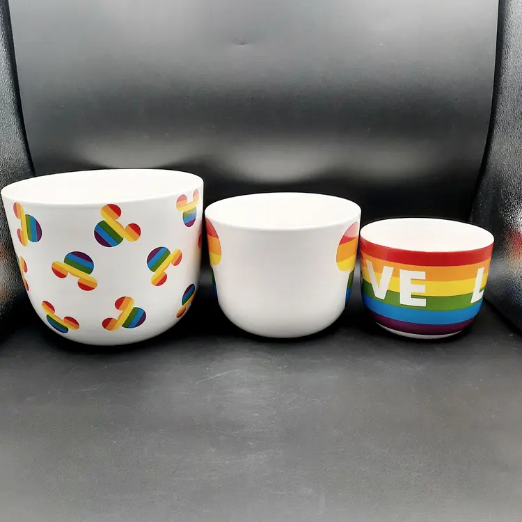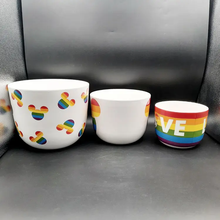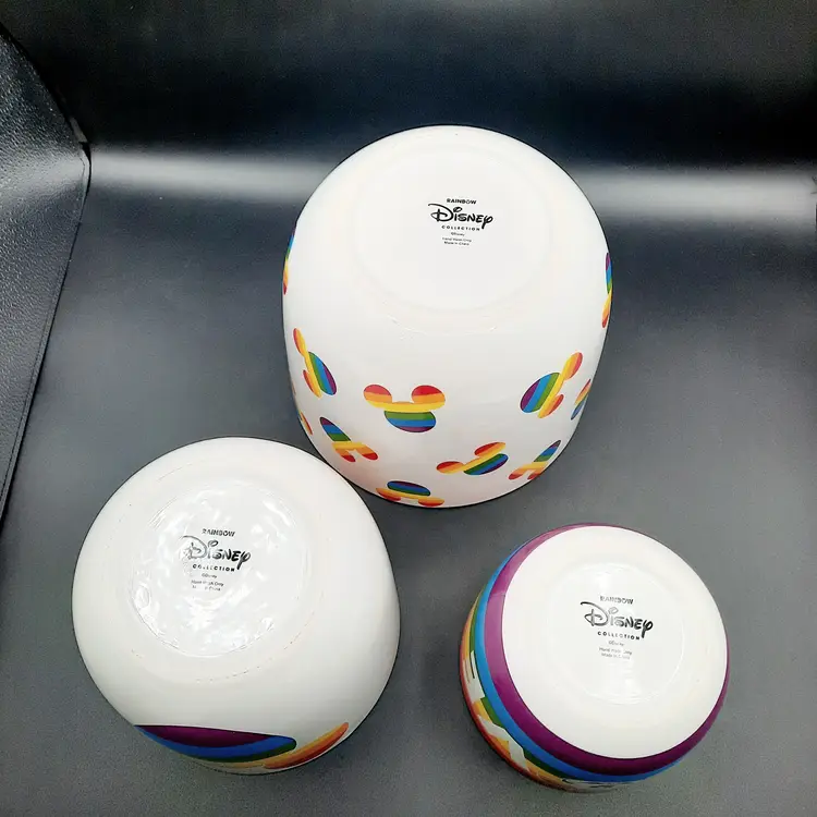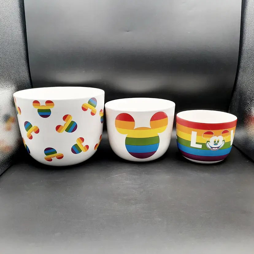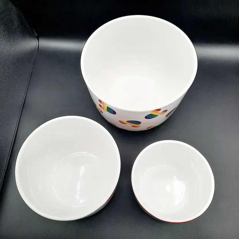 These fantastic fun bowls have never been used and are in great condition with a few design imperfections - light scratch/ nicks to paint, some bumps in glaze and a rough spot on interior of small bowl. Lg bowl - 8"W x 7 1/2"H Med bowl - 6 1/2"W x 5 1/2"H Sm bowl - 5"W x 4 1/4"H