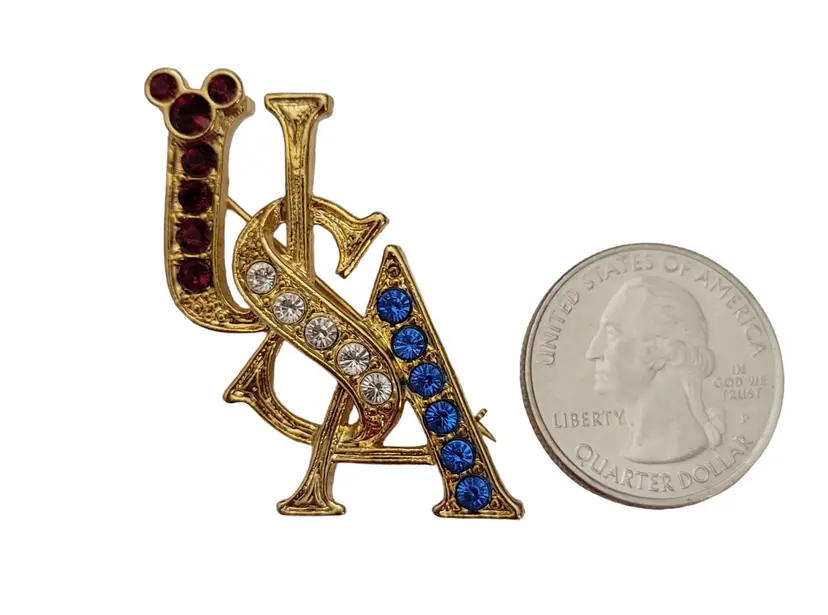 Show your patriotism on full display by wearing this Disney Mickey Mouse USA Patriotic Pin. It features gold-tone letters U S and A intertwined, embellished with red, clear, and blue faceted rhinestones pave-set along the letter's outline. This pin measures approximately 1.5 inches, just the right size just the right size to adorn clothing and accessories. The back is marked ©DISNEY on an oval cartouche, secured with a straight pin that functions properly.