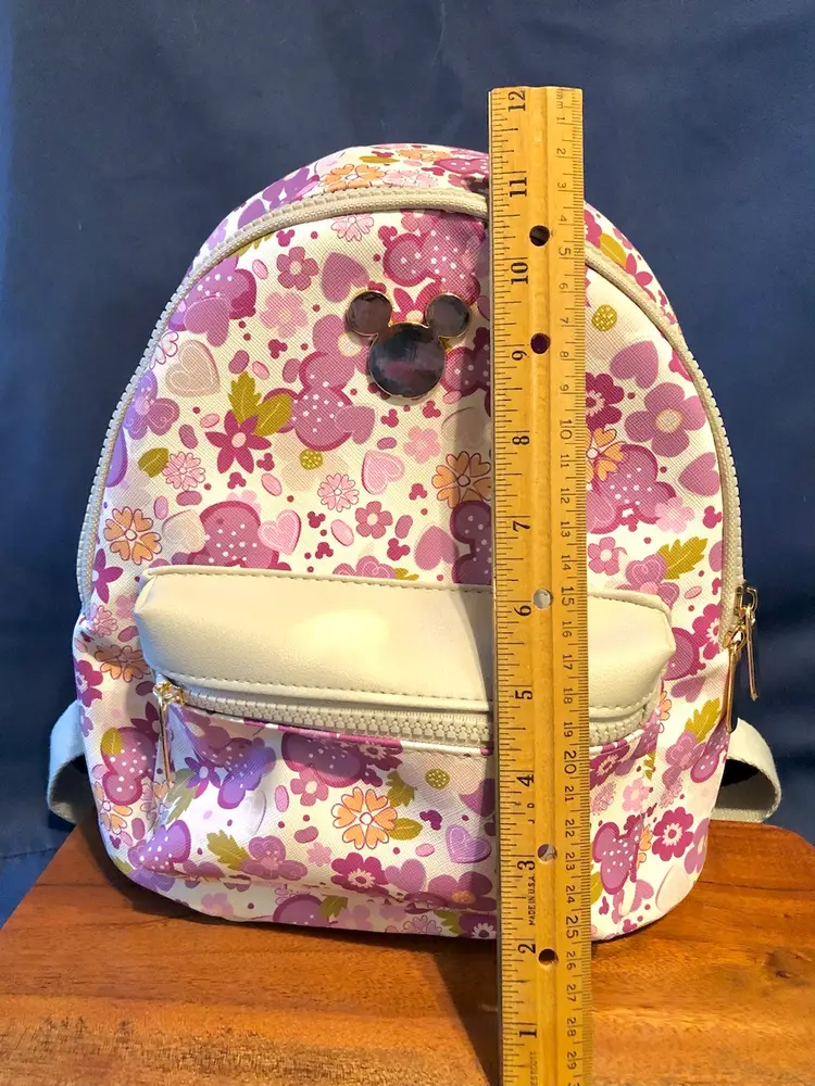 Here we have a gently used Disney Mini Backpack with Pink Florals and Purple MICKEY MOUSE by Bioworld. It is in excellent, clean condition with no stains, tears or damage.
