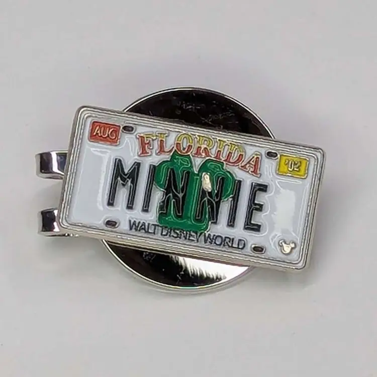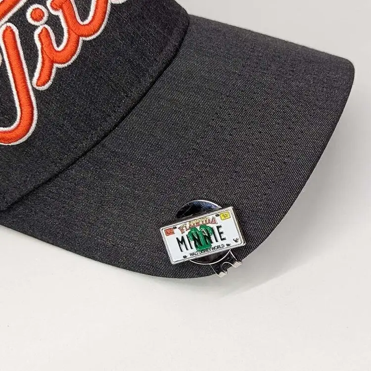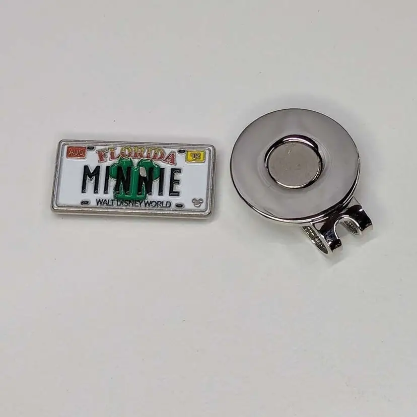 The Disney "Minnie Mouse" License Plate Golf Ball Marker with Magnetic Hat Clip is a set of 2 multicolor metal magnetic markers featuring Minnie Mouse and Disney themes. These markers come with a hat clip for easy attachment during golf games. Ideal for Disney fans and golf enthusiasts.