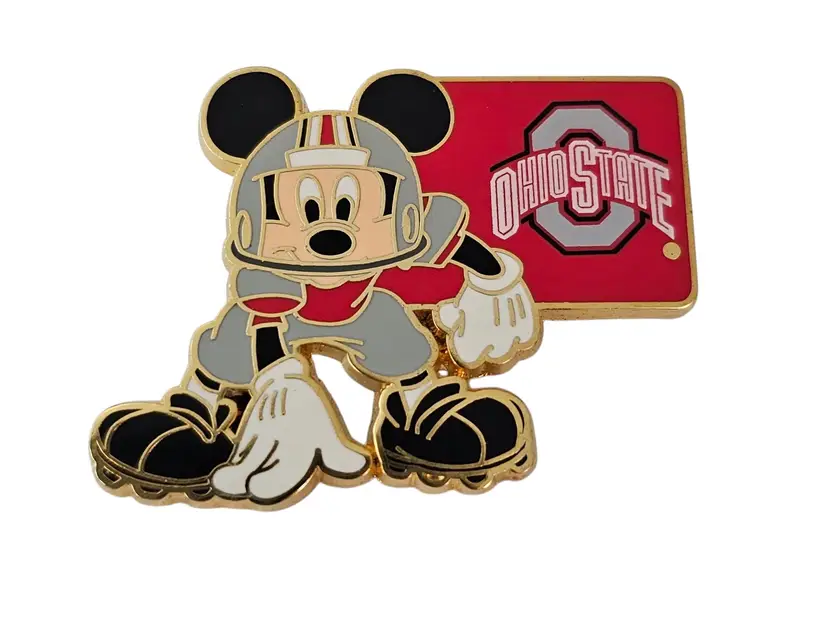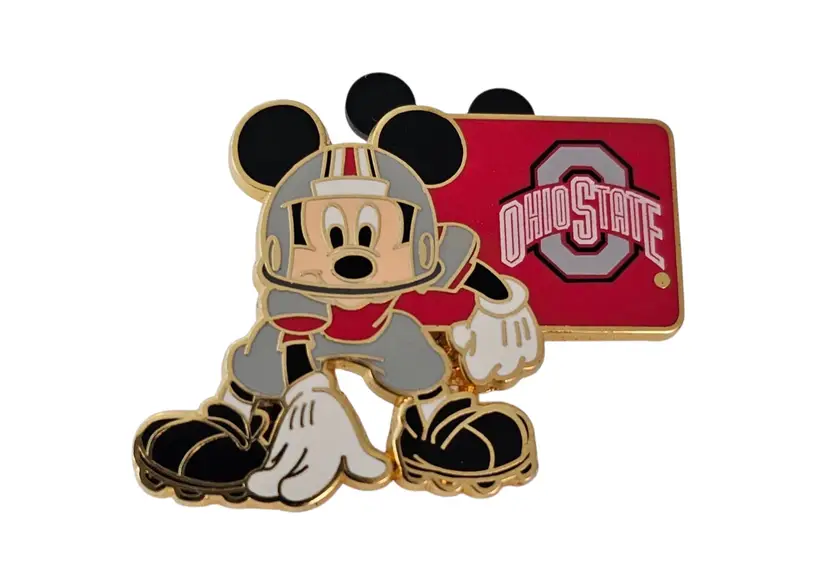 • Walt Disney World Mickey Pin • Disney NCAA Football Team Series • Ohio State University (Buckeyes) • Open edition • Featuring Mickey Mouse ready to spring into action as an Ohio State Buckeye • He is wearing a football player's red and grey/gray uniform and helmet • A red banner with the college's logo is behind him. • The back is marked Collegiate Licensed product, Official pin Trading 2008 ©Disney CHINA • It has a single post, with a black rubber Mickey Mouse head locking component • Good condition • C212