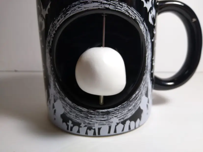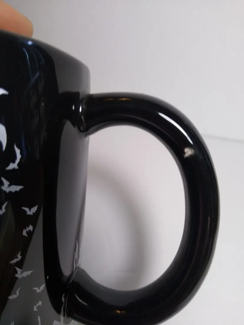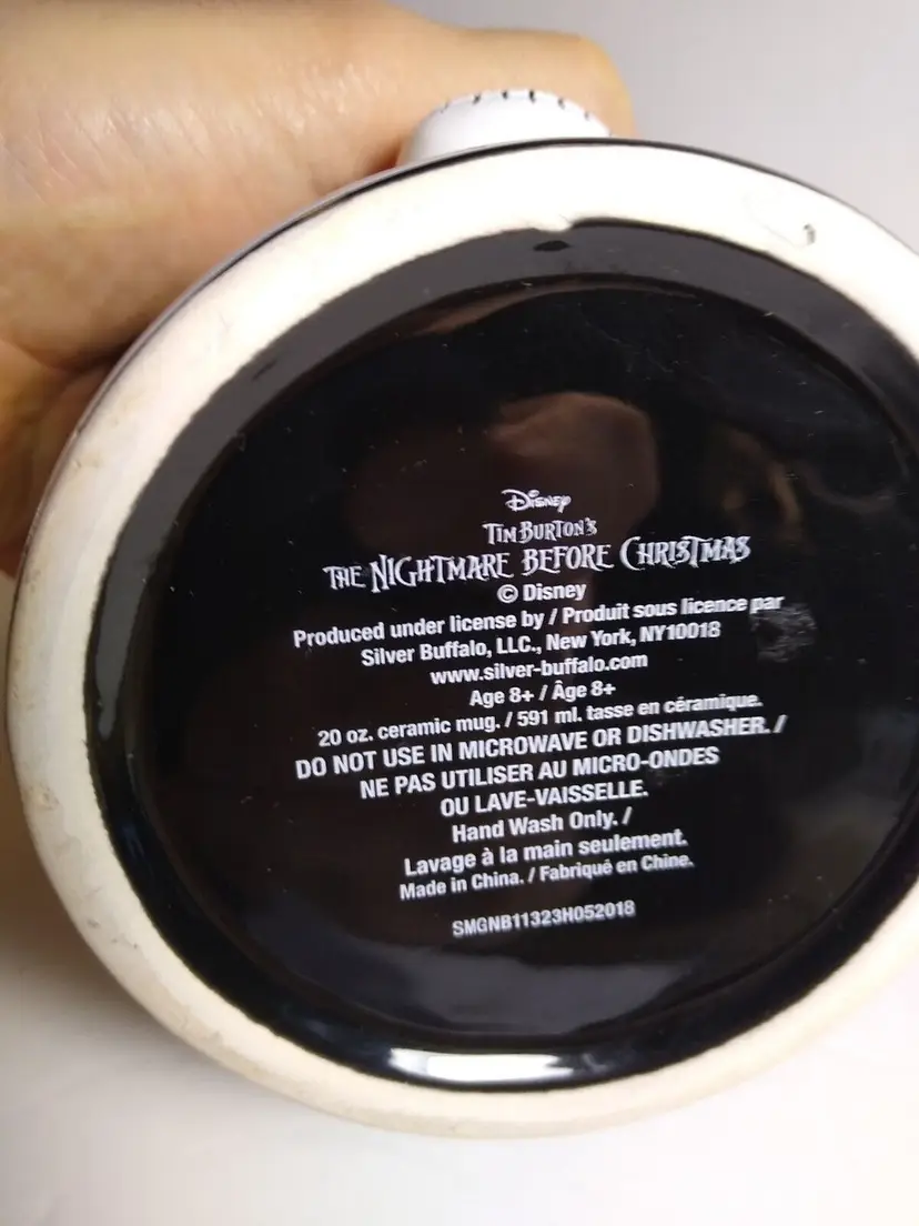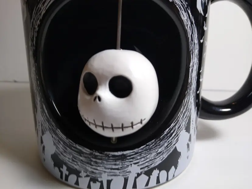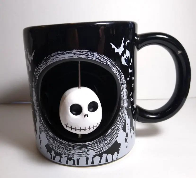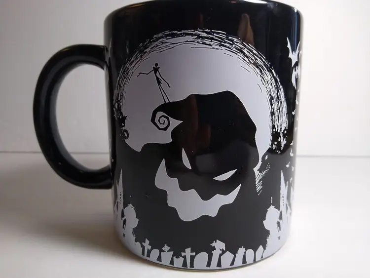 This Disney Nightmare Before Christmas mug features Jack Skellington, the Pumpkin King of Halloween Town, in a spinning head design. The large 20 ounce capacity ceramic and silicone mug is perfect for any fan of the beloved Disney character. The mug also features bats and the iconic Oogie Boogie, adding to its spooky design. The mug is part of the Disney by Silver Buffalo collection and is a must-have for any collector or fan of the franchise. The mug is perfect for Halloween or any day, and is sure to be a great addition to any collection.