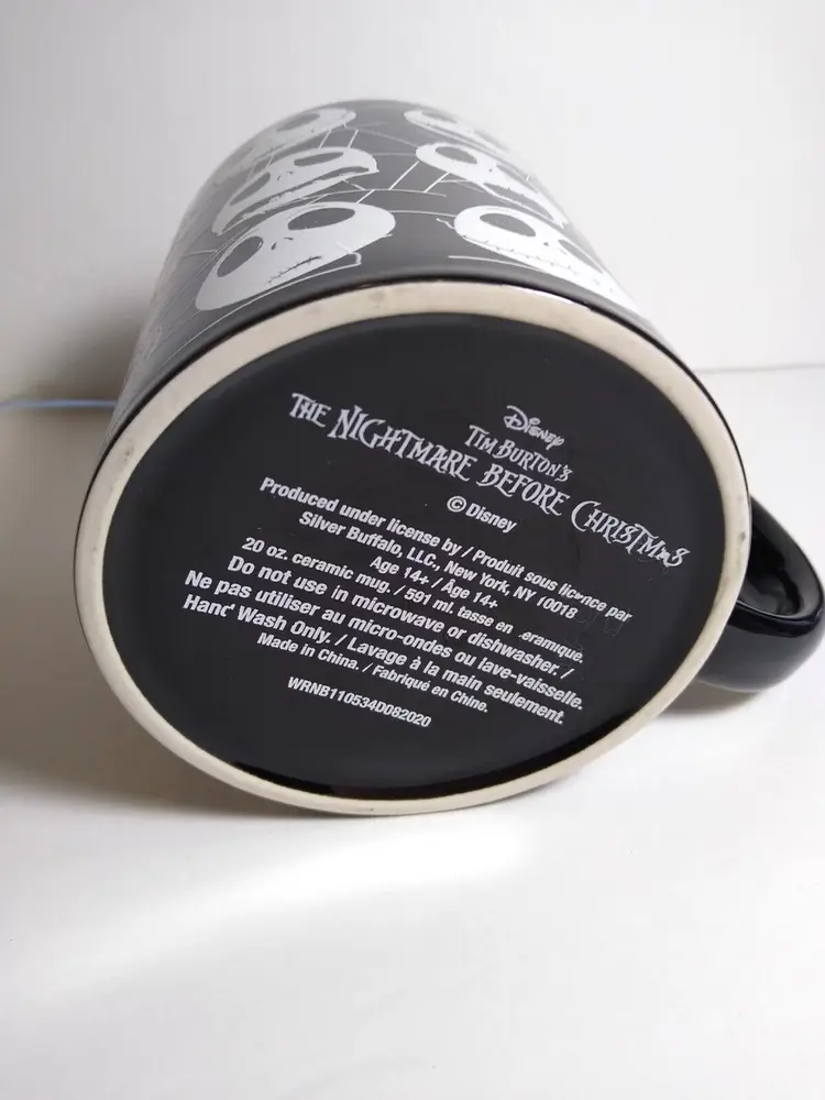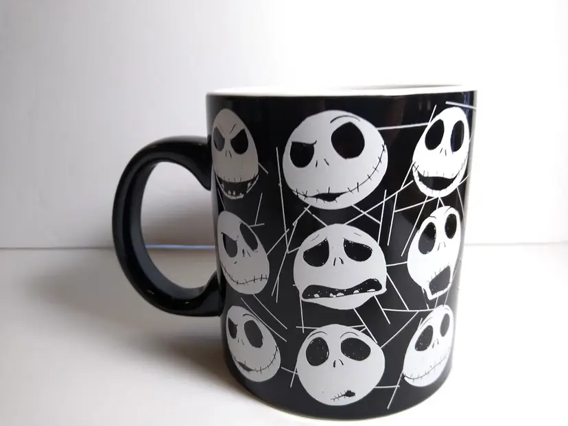 This GLOW IN THE DARK Disney mug features Jack Skellington's many faces, glowing in the dark. The 20-ounce ceramic mug is perfect for any fan of Nightmare Before Christmas. The mug is made by Disney by Silver Buffalo. It is a great addition to any Disneyana collection or as a standalone piece. The mug is large and features multiple expressions of Jack Skellington, making it a unique and fun piece.