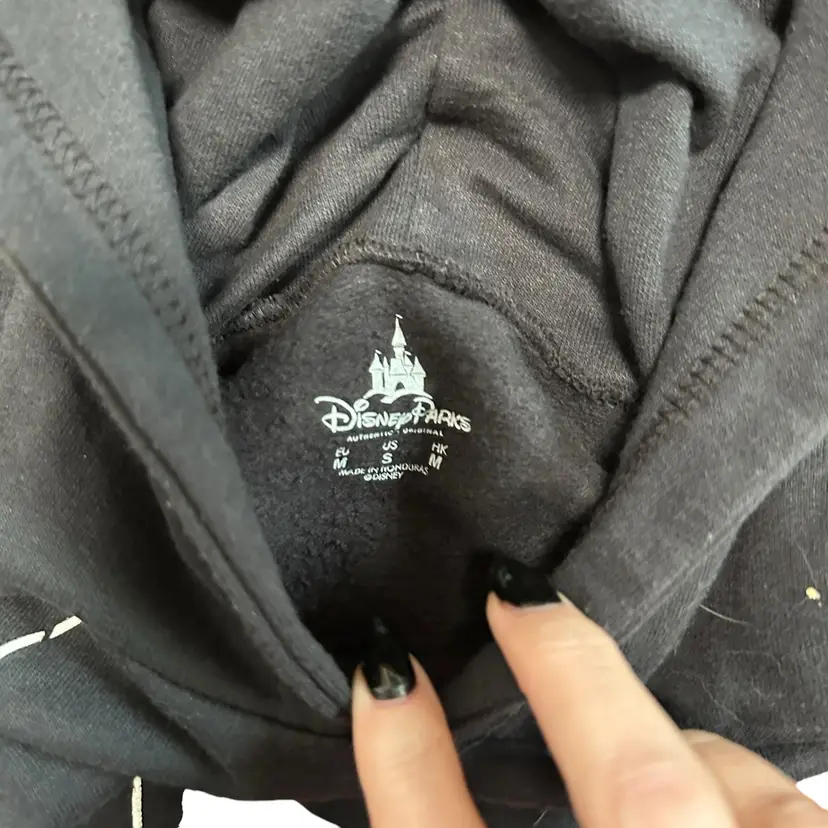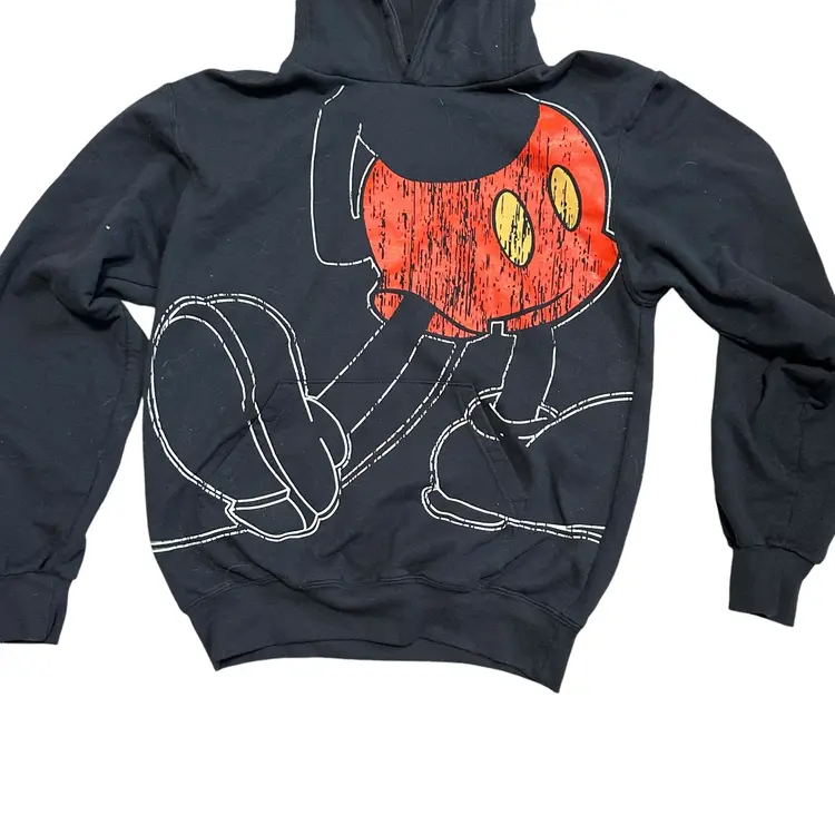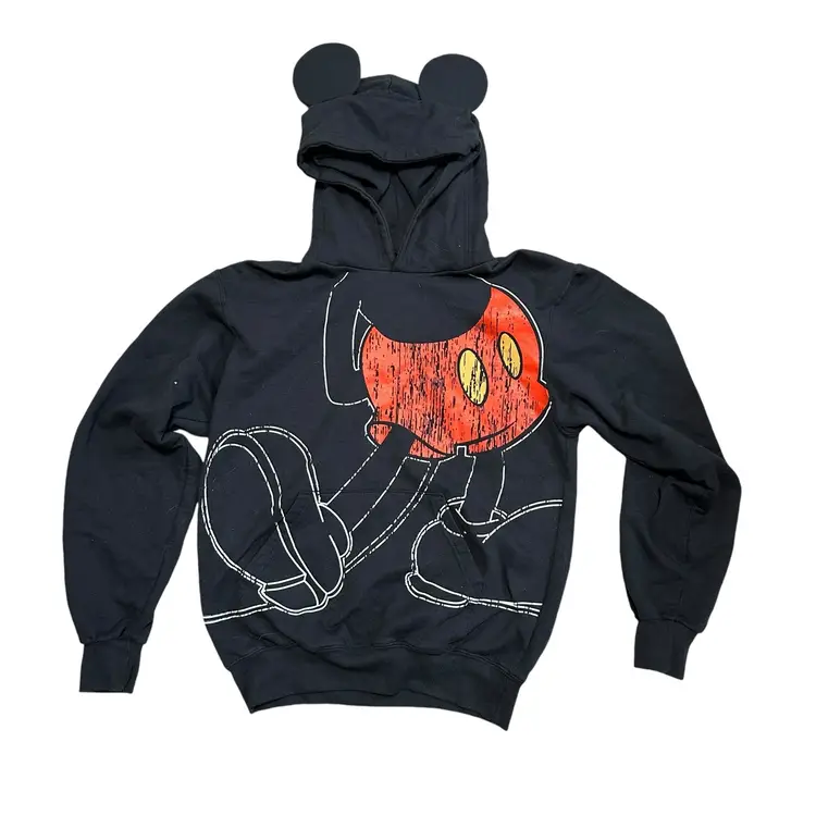 Disney Parks Black Mickey Mouse Hoodie With Ears Size Small Vintage Distressed Print Style Modern Sweatshirt Hoodie Long sleeve, hooded warm fall and winter weather Pre-owned excellent condition front kangaroo pockets Oversized casual fit small women's