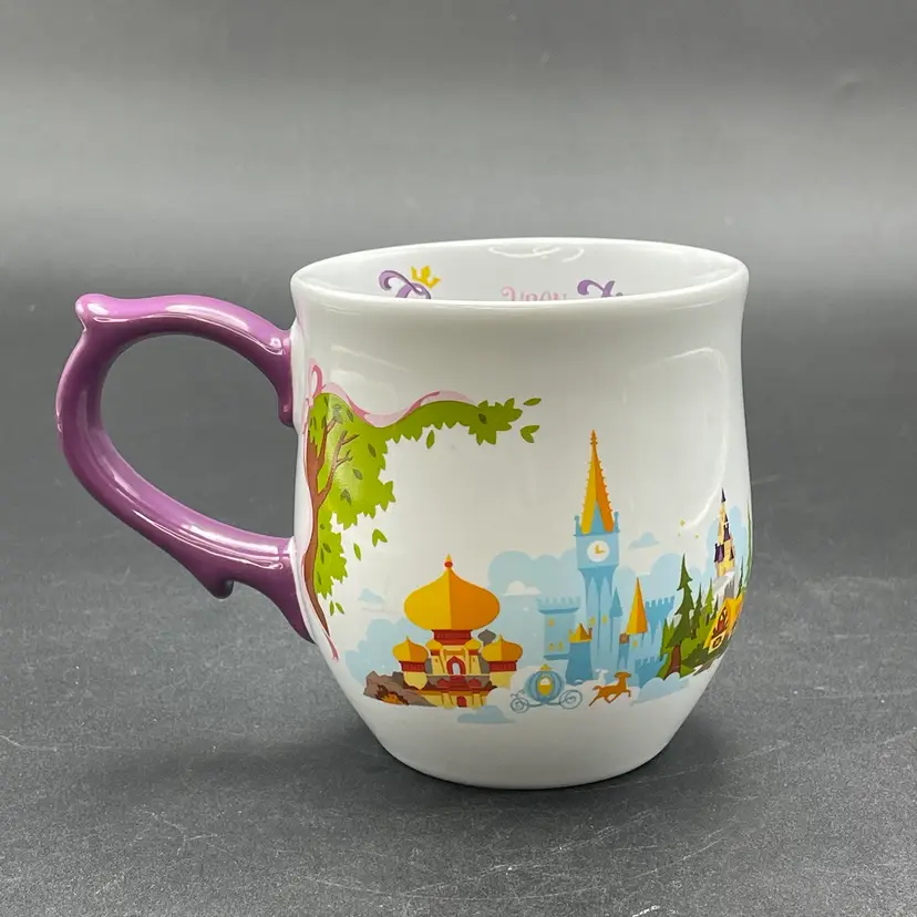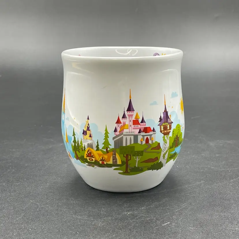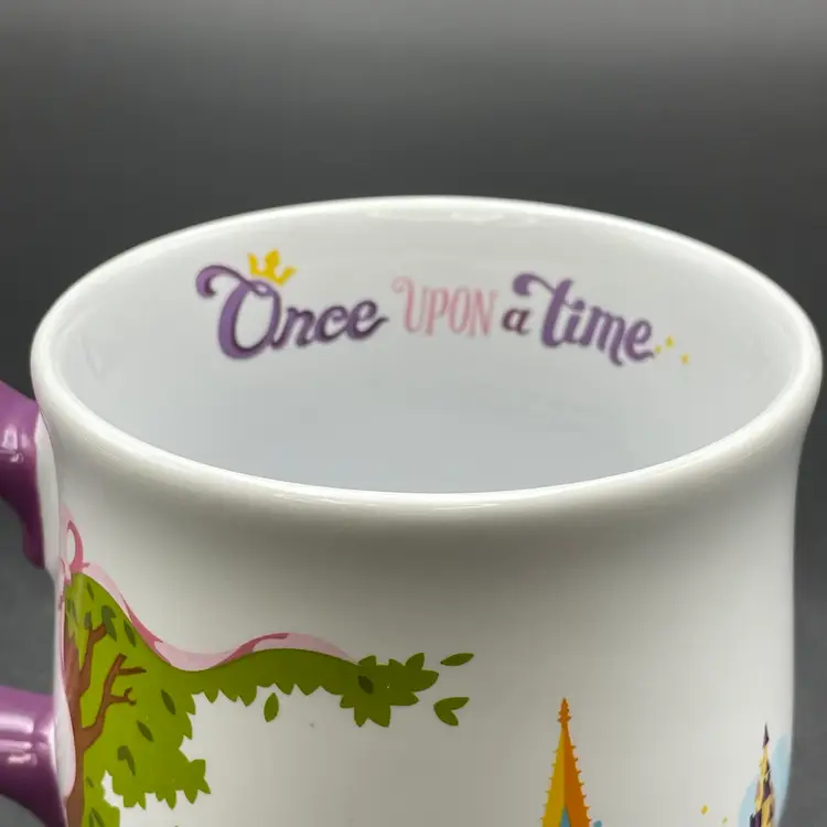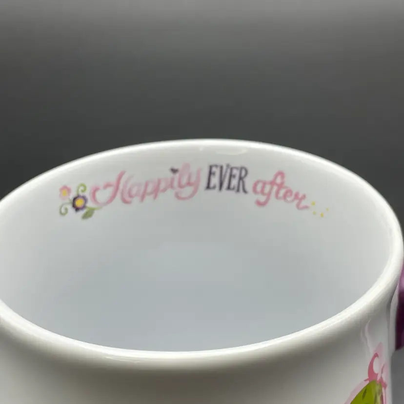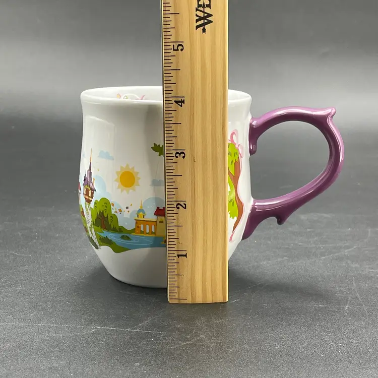 This is a Disney Parks Once Upon a Time Happily Ever After coffee mug. Measures approximately 4" tall x 3.5" across the top, and holds approximately 16fl oz. There is a little utensil scuffing on the inside bottom of the cup as shown in pictures. No other major flaws.