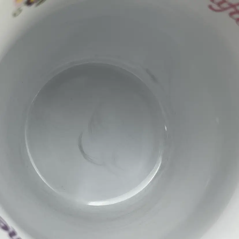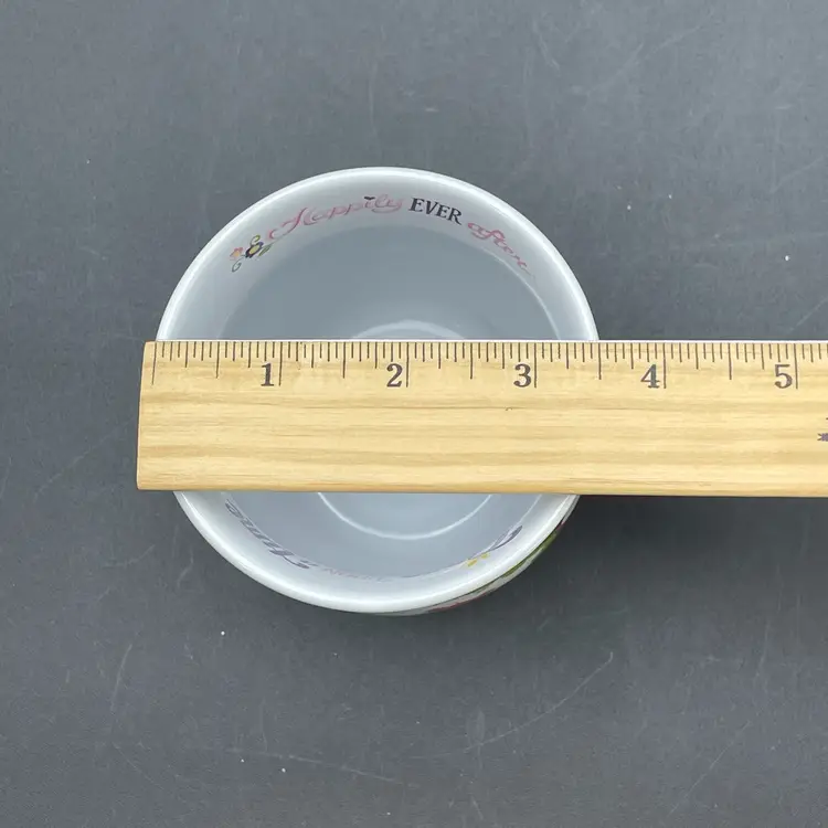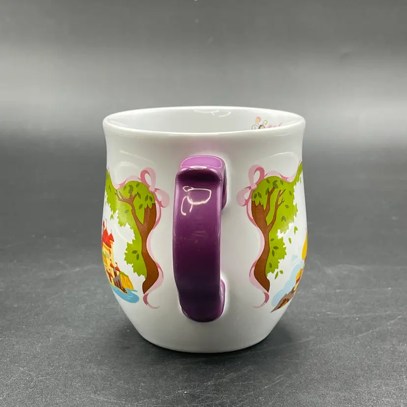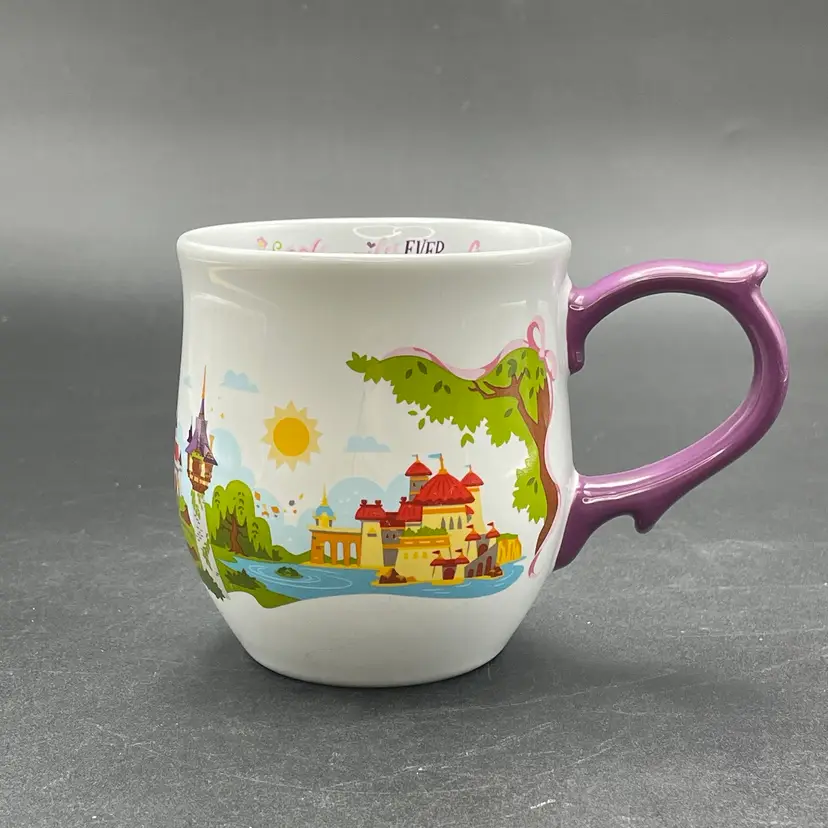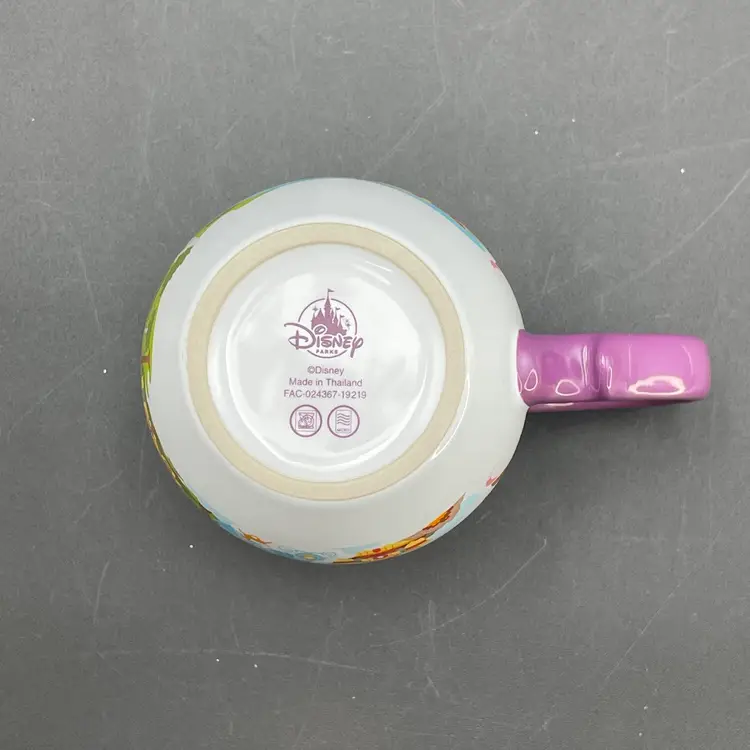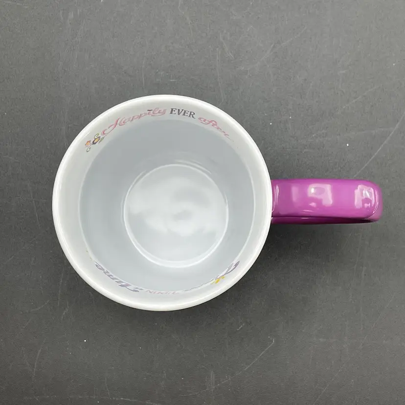 This is a Disney Parks Once Upon a Time Happily Ever After coffee mug. Measures approximately 4" tall x 3.5" across the top, and holds approximately 16fl oz. There is a little utensil scuffing on the inside bottom of the cup as shown in pictures. No other major flaws.