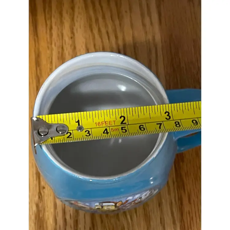 Have yourself a delightful day with this stackable Tsum Tsum coffee cup featuring Stitch from Disney's classic Lilo and Stitch. Large hot beverage mug Stackable design - can be stacked with Mickey, Minnie, and Marie Tsum Tsum mugs Contrast blue handle High gloss finish Part of the Disney Tsum Tsum Mug Collection Microwave and dishwasher safe Ceramic Holds 14 oz. 4 1/2'' H x 4'' Diameter (5'' W at handle) Although it is preowned it is in excellent condition. Please refer to the pictures.