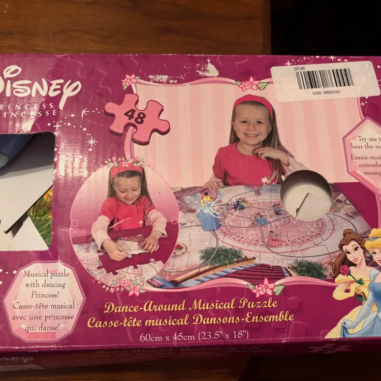 48-piece musical dance-around puzzle. Pink princess design with illustrated play scene. Bright pink tones and feminine accents. Great collectible for fans of princess puzzles.