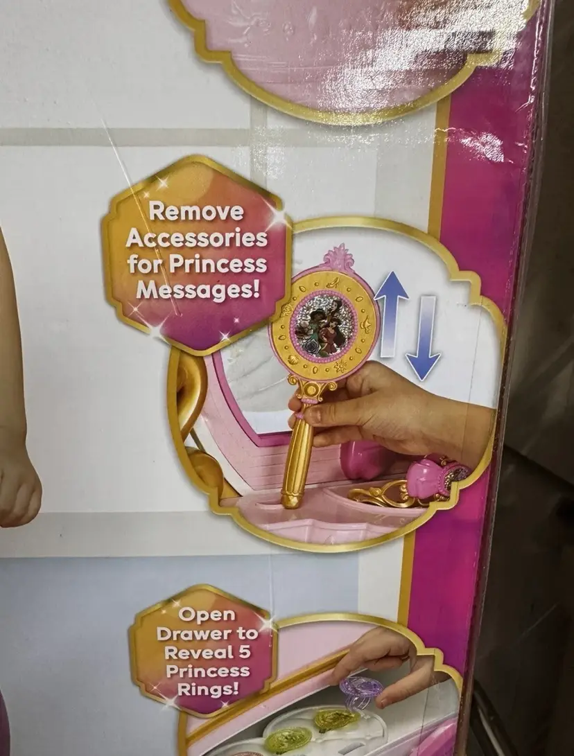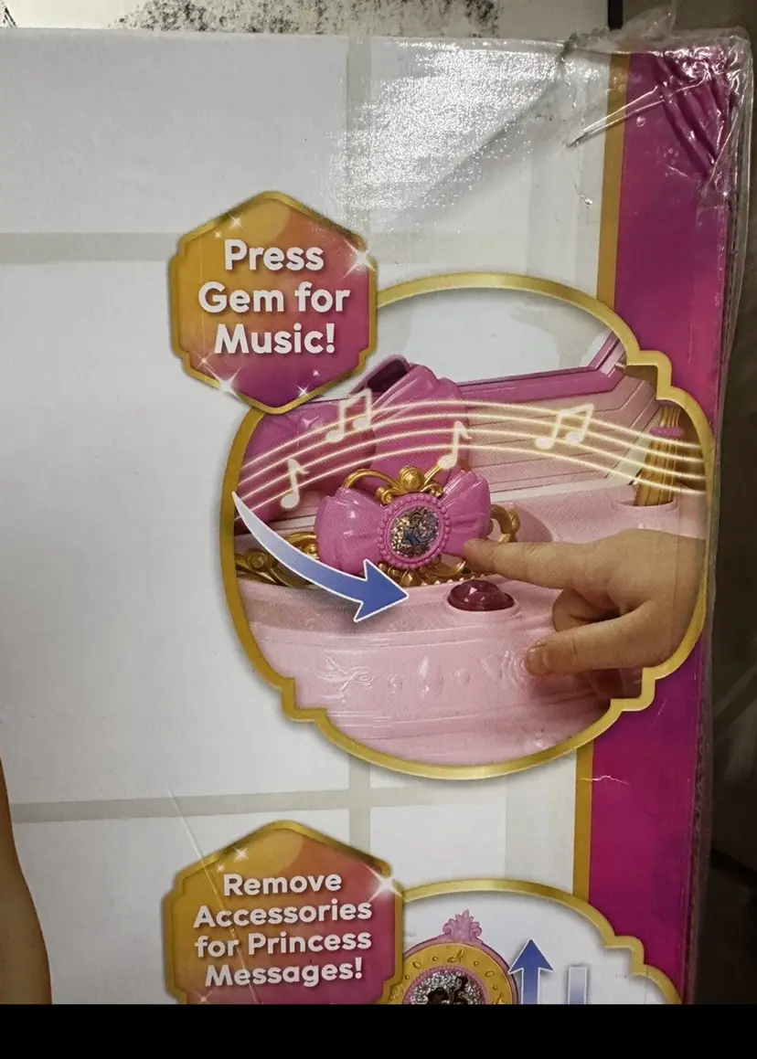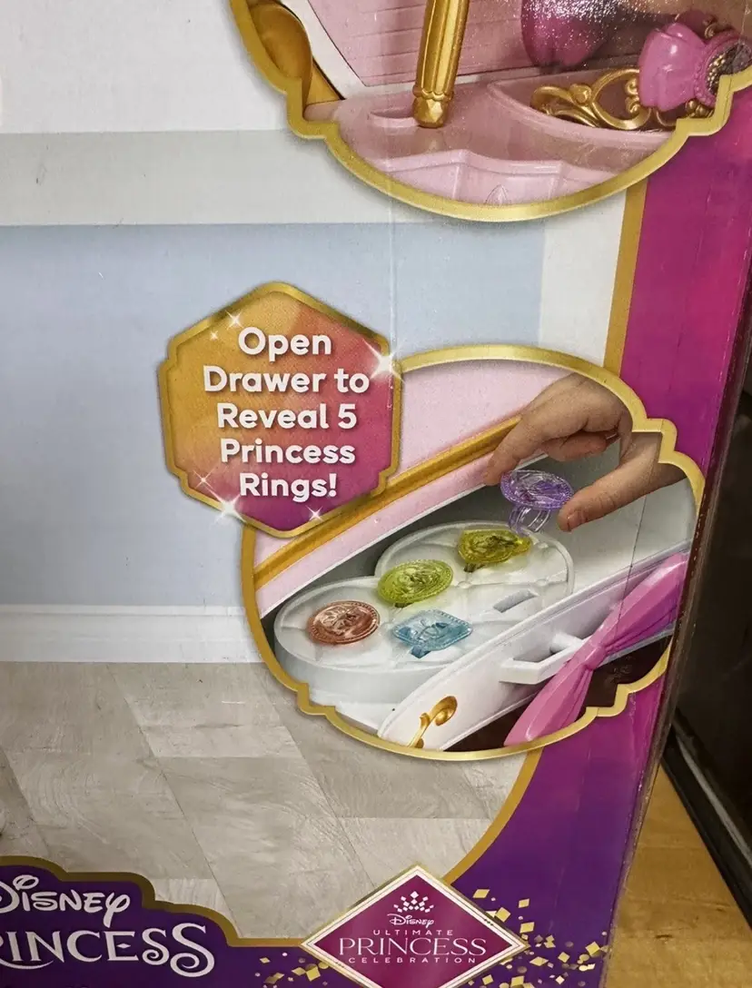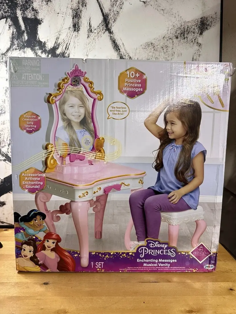 For sale is a brand new unopened Disney Princess Enchanting Messages Musical Vanity from Jakks Pacific. This elegant vanity features 16 positive messages inspired by the stories of 8 Disney Princess characters: Ariel, Belle, Cinderella, Jasmine, Moana, Mulan, Rapunzel, and Tiana. Standing 3 feet high, this deluxe vanity is the perfect place to get ready for any moment. It included multiple accessories that activate the messages and sound effects, and the table top gem activates the Ultimate Princess Celebration song, "Starting Now", by Brandy.