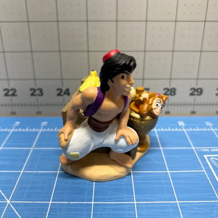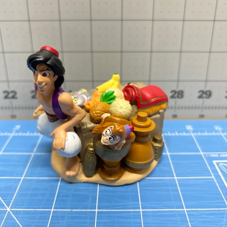 Here is a plastic Aladdin & Abu figurine from Disney. It features Aladdin & Adu at a food stand. They are 2 5/8" by 3 3/4" across by 3 3/8" tall and in very good preowned condition based on marks & paint wear from use. Please see our Not Just China store for more Disney & collectibles.