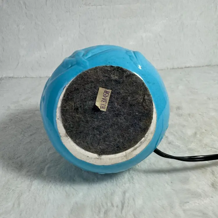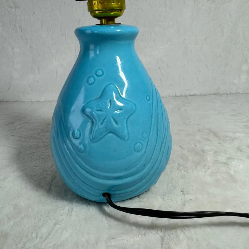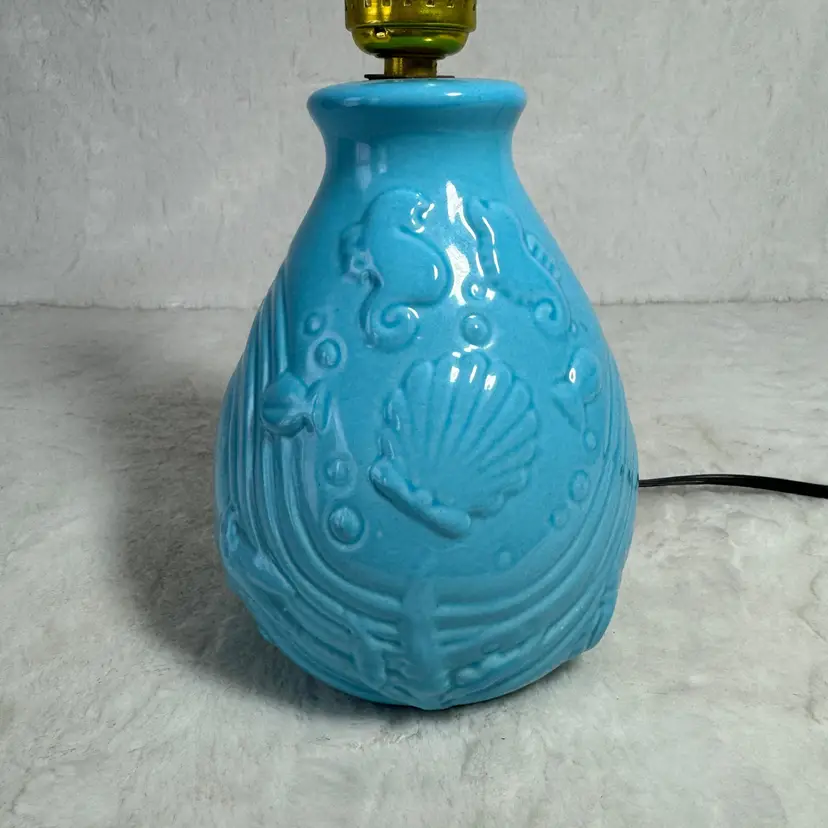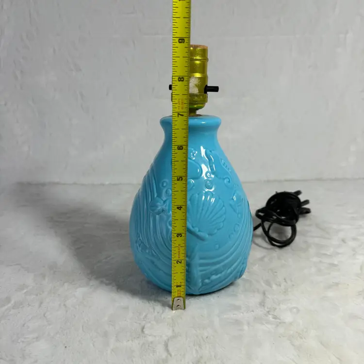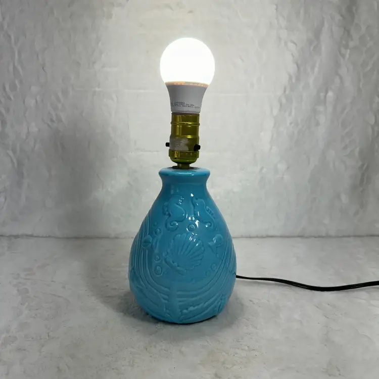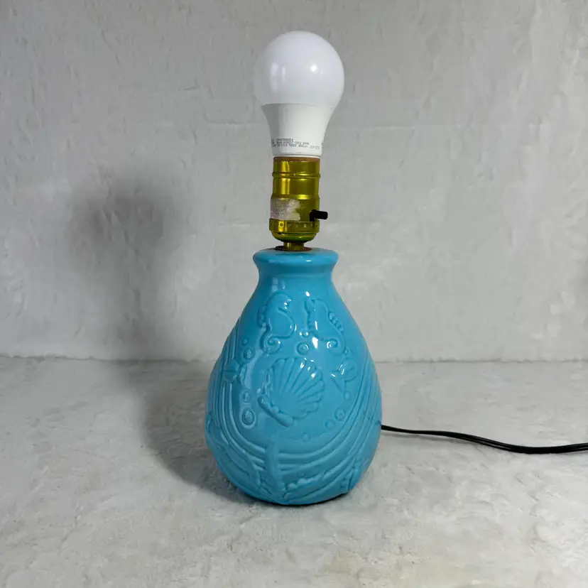 A distinctive lamp embossed on Base with the Theme from the great 1989 animated Disney movie, “The Little Mermaid”. I also do not know when this was made, but it is likely to have been made in the early 1990s. This would be perfect for any Little Mermaid-themed room! The pretty ceramic base of the lamp is a nice blue color and has various sea-related shapes molded on it, such sea horses, clamshells, bubbles, and fish. The light bulb, which is not included, should not exceed 60 watts with this lamp. The lamp stands approximately 9 inches tall, and the base is approximately 5 inches in diameter at its widest point. The black power cord is about 6 feet long. The lamp has been tested and is in good condition and works fine. The base has no scratches, chips, or cracks.