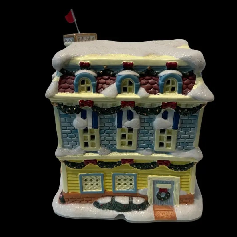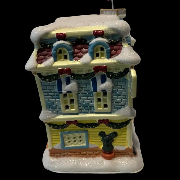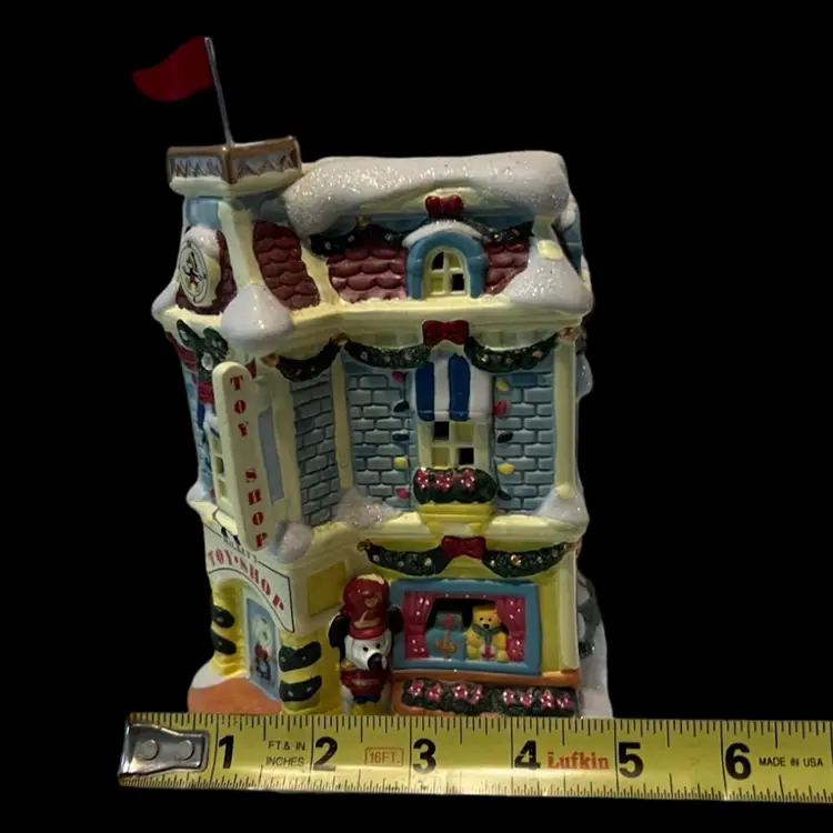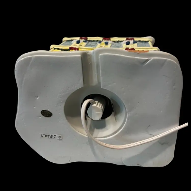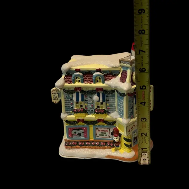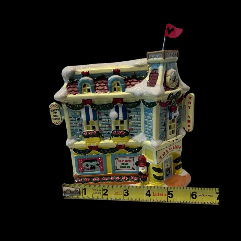 Mickey Mouse’s adorable little light up toy shop it was tested and works. We will be sending the cord for the bulb but no light bulb. It’s very unusual to find the toy shop complete with the flag. No chips or cracks. In wonderful condition and ready to add to any Christmas village! See photos for condition and exact measurements.