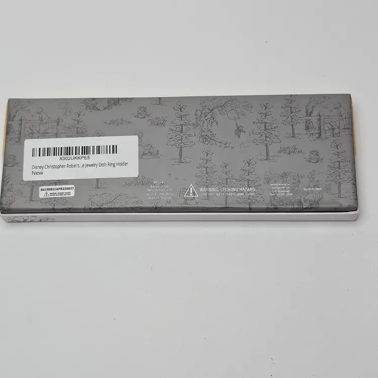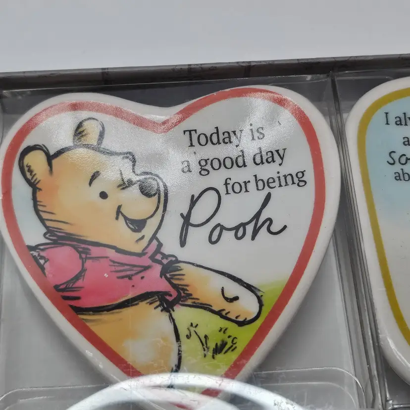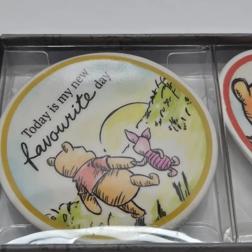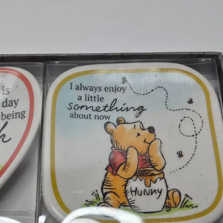 This is a set of three Disney Winnie the Pooh ceramic trinket dishes, featuring Pooh, Piglet, and honey. The dishes are brand new in their original packaging, ready to be added to your Disneyana collection. These dishes are perfect for fans of the classic Winnie the Pooh TV show and movie, and make a great gift for any occasion. The dishes were made in China and are of excellent quality.