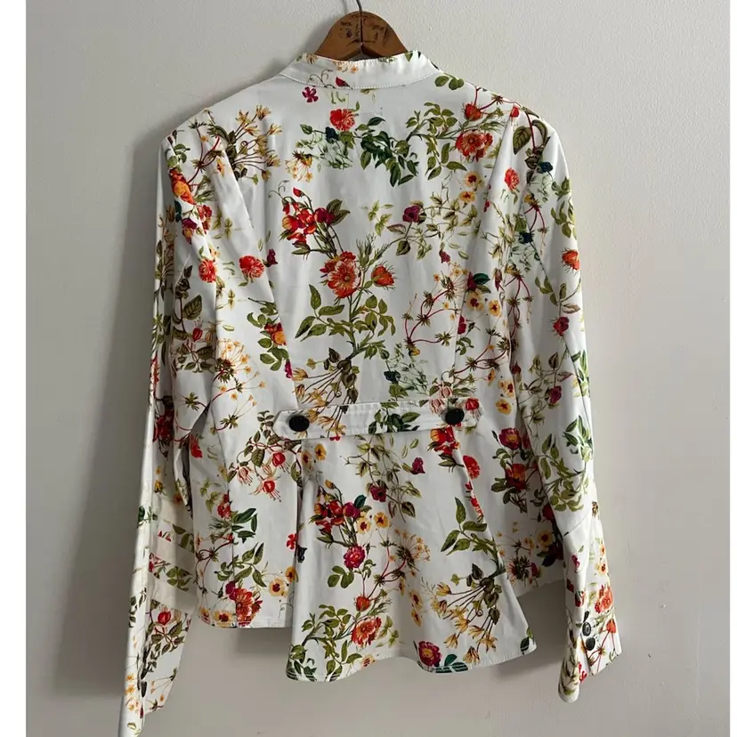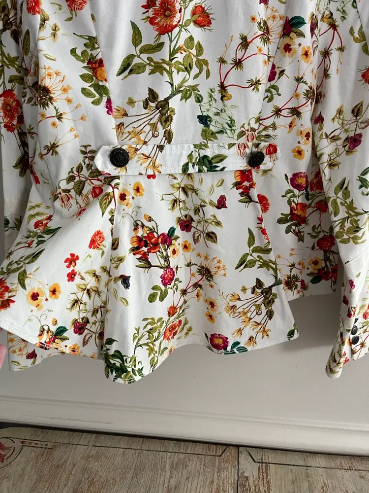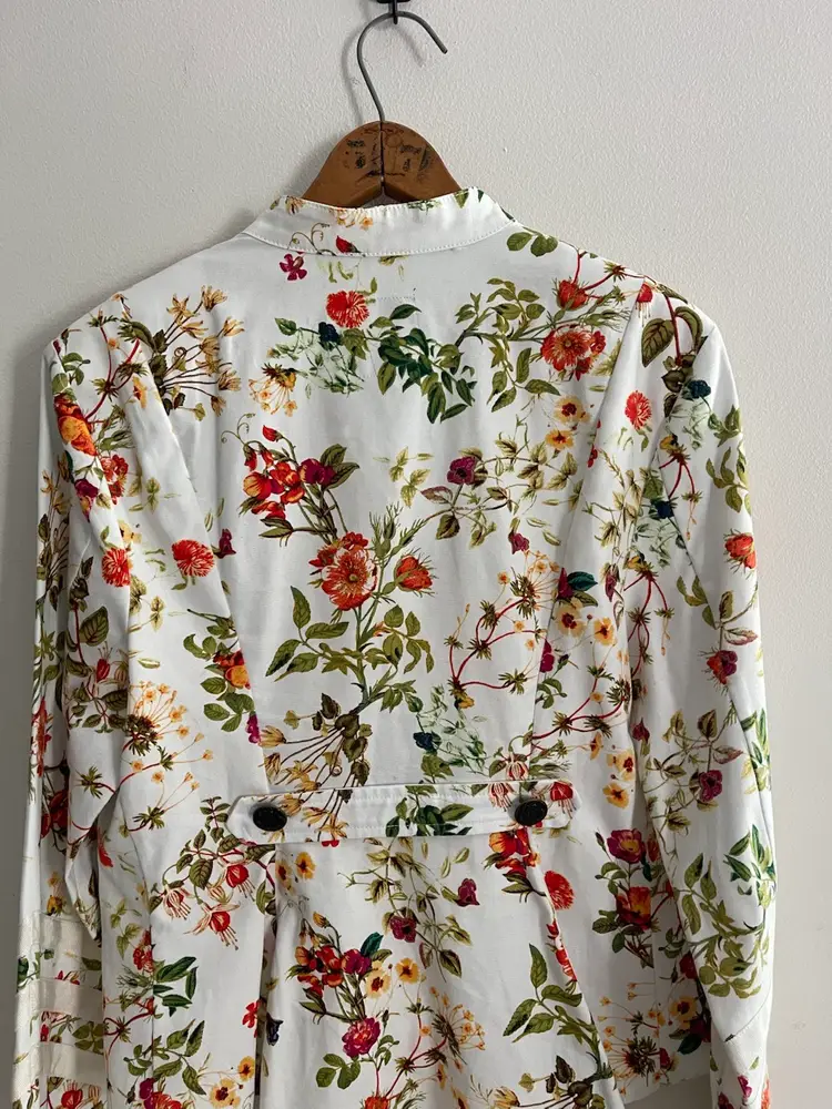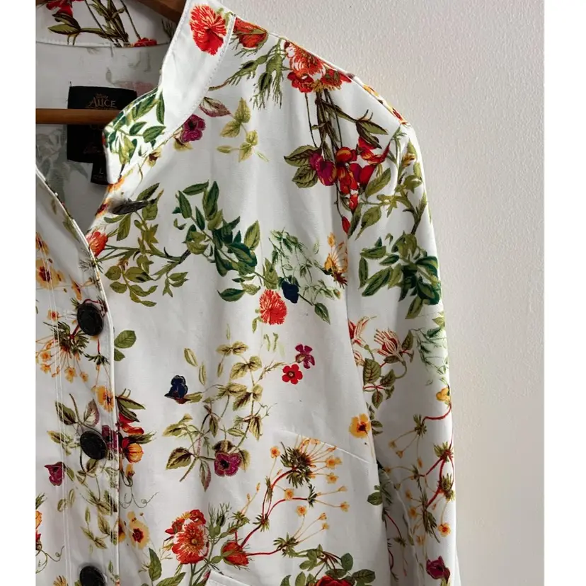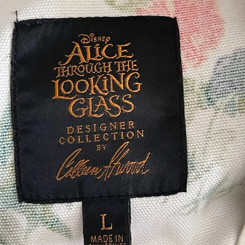 Disney x Colleen Atwood Designer Collection "Alice Through The Looking Glass" White Floral Jacket Women's Size Large 100% Cotton Beautiful Red, Orange Garden Theme Print on a White Semi Fitted Jacket Grosgrain Ribbon Detail on Sleeves Mandarin Collar Antique Bronze Floral Embossed Buttons Back Belt For Flattering Fit Flap Pocket Detail (NO Pocket) Hi Lo Hemline Unlined Perfect for Disney Bounding, Cosplay, Festival Season, Renaissance Fairs, Fairycore, Cottagecore, Wimsy-goth, So many aesthetics with this great piece!