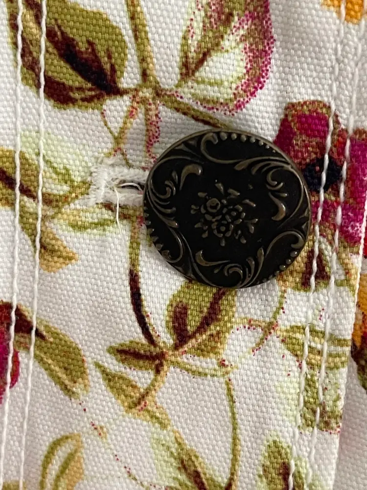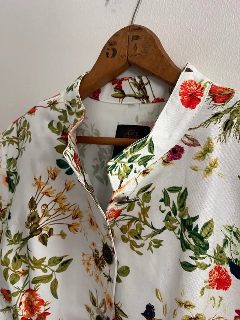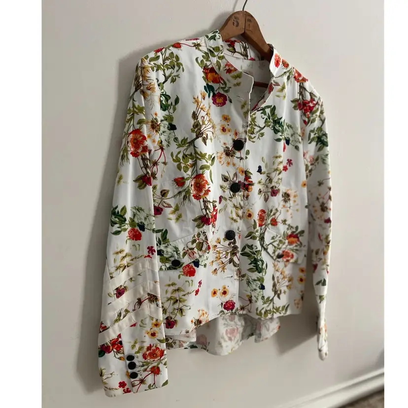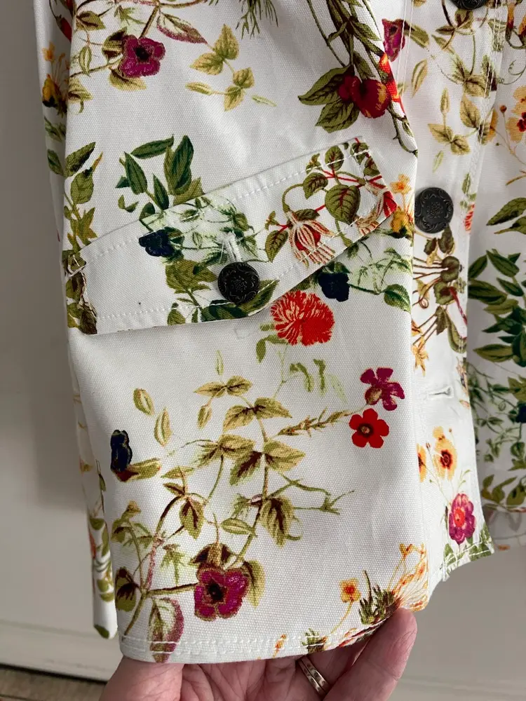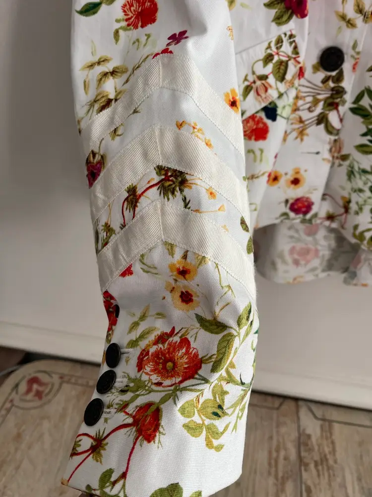Disney x Colleen Atwood Designer Collection "Alice Through The Looking Glass" White Floral Jacket Women's Size Large 100% Cotton Beautiful Red, Orange Garden Theme Print on a White Semi Fitted Jacket Grosgrain Ribbon Detail on Sleeves Mandarin Collar Antique Bronze Floral Embossed Buttons Back Belt For Flattering Fit Flap Pocket Detail (NO Pocket) Hi Lo Hemline Unlined Perfect for Disney Bounding, Cosplay, Festival Season, Renaissance Fairs, Fairycore, Cottagecore, Wimsy-goth, So many aesthetics with this great piece!