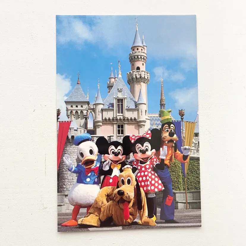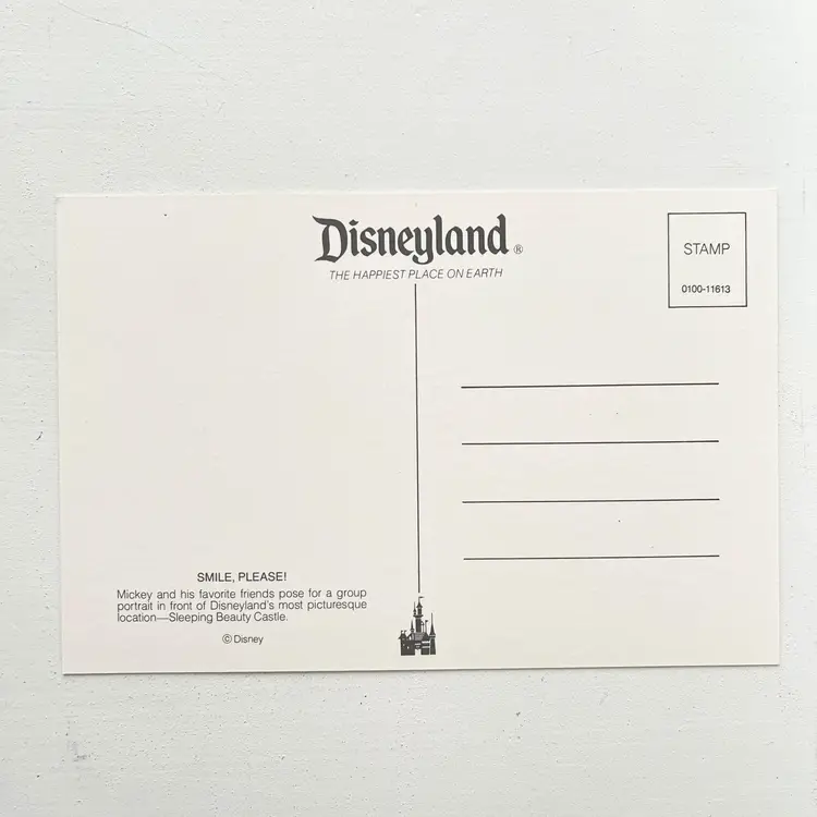 Disneyland California Postcard Mickey Favorite Friends Portrait Big Smiles 1980s Original Postcard from Disneyland Anaheim California (Los Angeles, Orange County) The Happiest Place On Earth SMILE, PLEASE Image of Mickey and his favorite friends posing for a group portrait in front of Disneyland's most picturesque location – Sleeping Beauty's Castle Continental Postcard No. 0100-11613 Condition: Unused. Unposted. Good condition. Measures 6 inches x 4 inches Packaged in a plastic sleeve inside a rigid envelope Visit my store to see more vintage ephemera, advertising, novelties, gifts, estate sale and yard sale finds https://district.net/u/finderspickerspaper SKU Disney