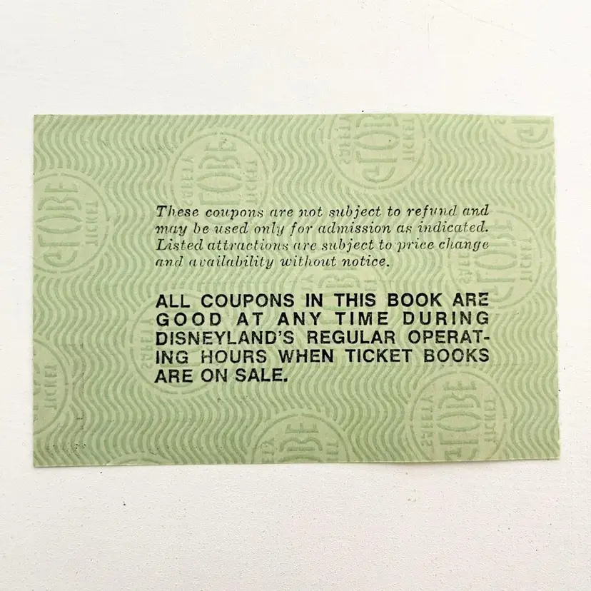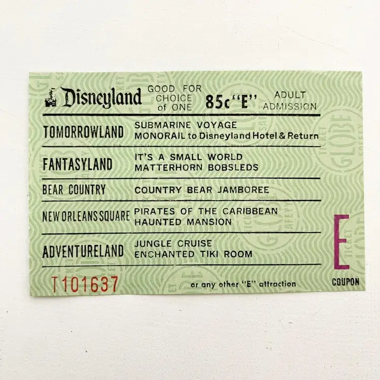 Disneyland Theme Park Adult E Ticket Coupon Vtg 1970s Haunted Mansion Tiki Room Disneyland Anaheim, California Choice of One E Ticket Ride or Any Other E Attraction Tomorrowland: Submarine Voyage, Monorail to Disneyland Hotel Fantasyland: It's A Small World, Matterhorn Bobsleds Bear Country: Country Bear Jamboree New Orleans Square: Pirates Of The Caribbean, Haunted House Adventureland: Jungle Cruise, Enchanted Tiki Room Globe Ticket No. T101637 Condition: Unused. Good condition. Measures 4 inches x 2-1/2 inches Packaged in a plastic sleeve inside a rigid envelope Visit my store to see more vintage ephemera, advertising, novelties, gifts, estate sale and yard sale finds https://district.net/u/finderspickerspaper SKU Disney