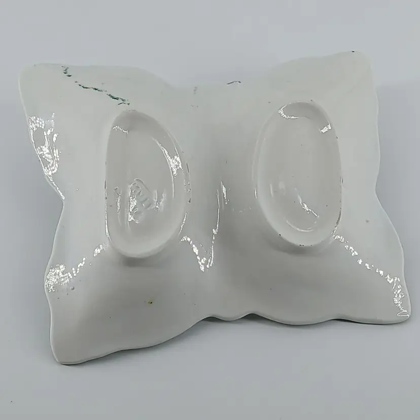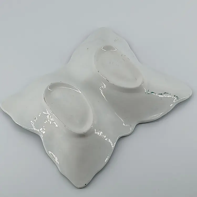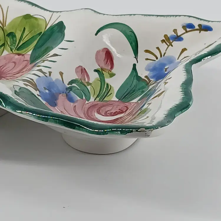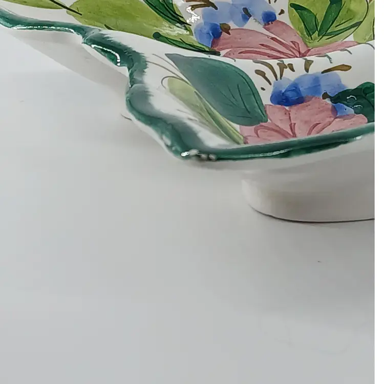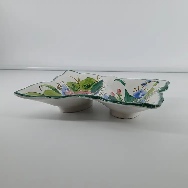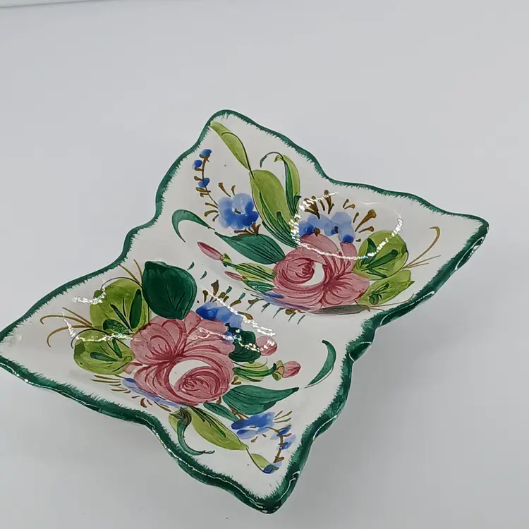 This hand painted dish from Italy is a divided dish. I have only had it on display as shown in 2nd photo. Measurements are 7 5/8 x 6 5/8 x 1 3/4 inches. I am showing two corners where there is the slightest of chips. I purchased this dish approximately 15 years ago. Always been on display, but have moved a couple times, hence little chips.