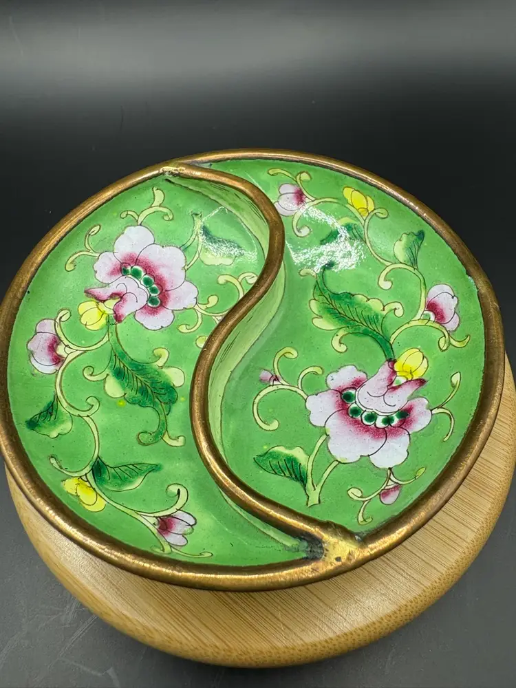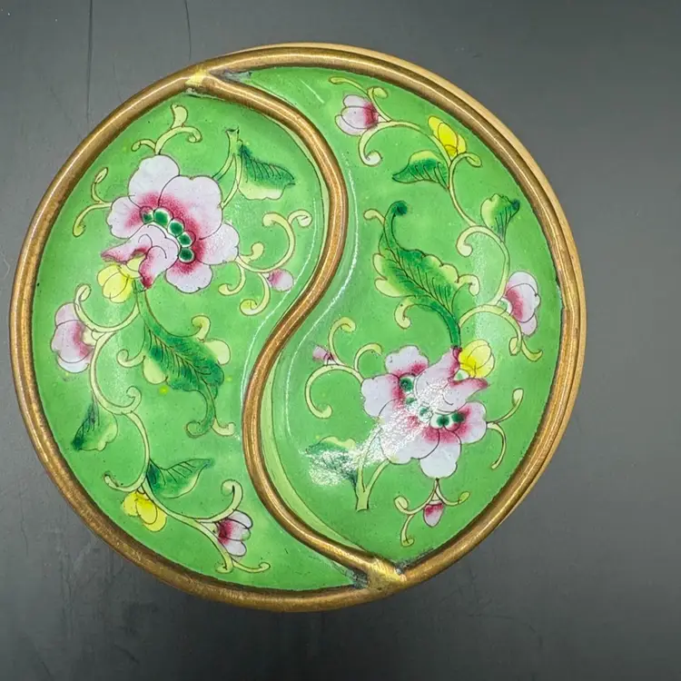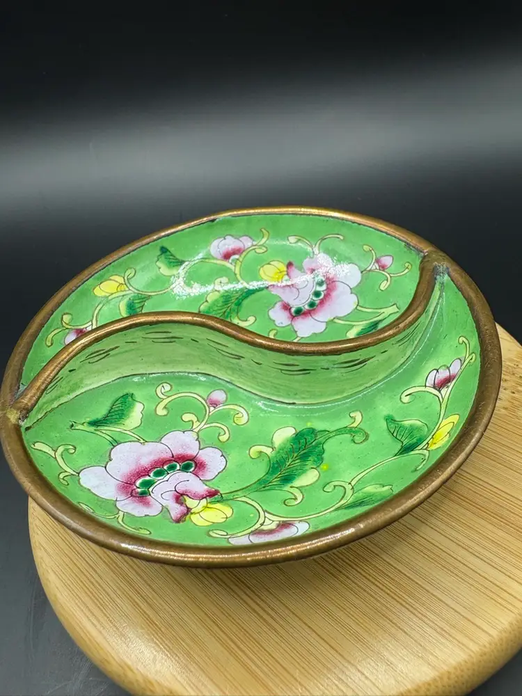 Divided Trinket Dish Cloisonné Design with pink flowers on green background Metal is brass Outside part of dish is paler green Measures 3 1/2 inches round Research indicates Chinese pre1978 In excellent condition