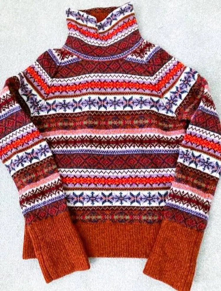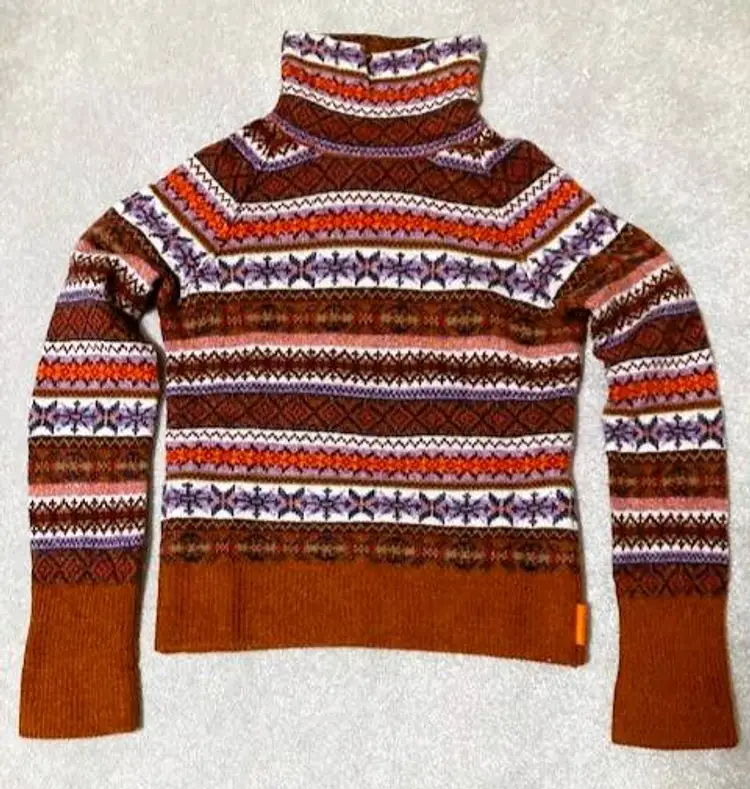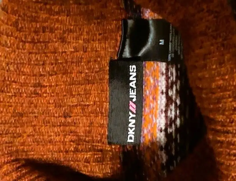 Warm fall and winter cozy colors. 100% Lambs wool DKNY turtleneck sweater. Juniors Size M. Sleeves uncuffed measure 29" from shoulder. Sweater measures 19" from base of neck. Dry Clean only. Very good condition.