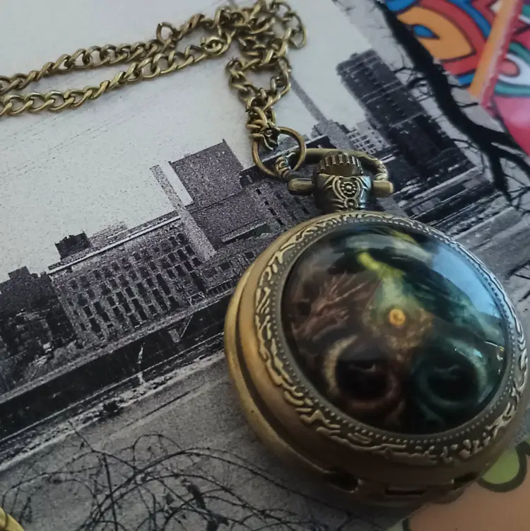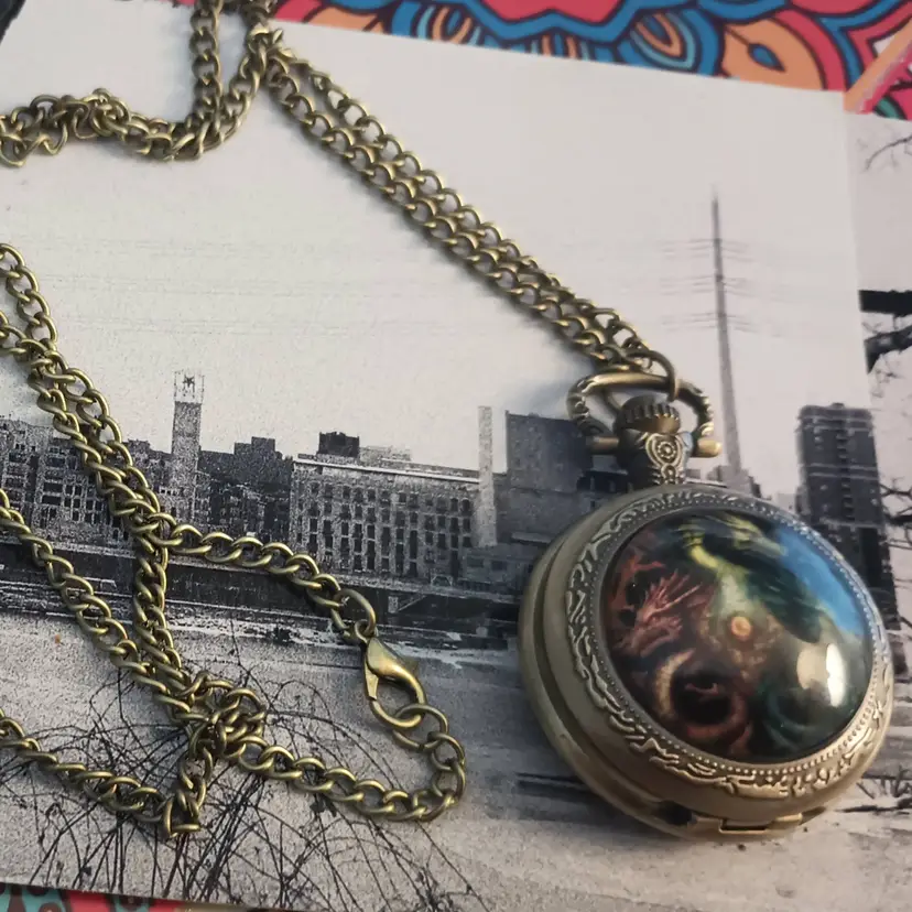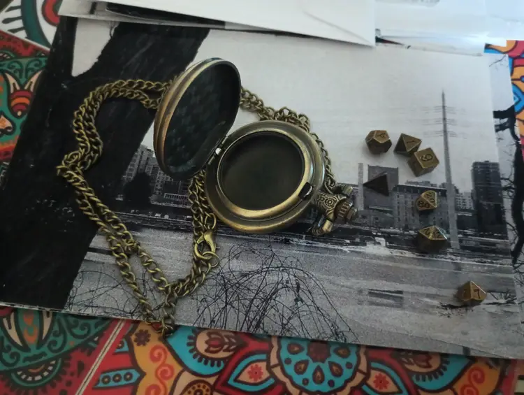 Pocket watch dice charm a auniqueblend of time and chance, this pocket watch features a vintage design filled with colorful multi sided dice. Attached to a sturdy chain necklace,making it a perfect gift for gamers and collectors.