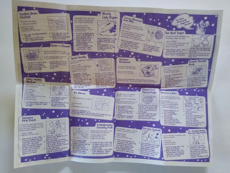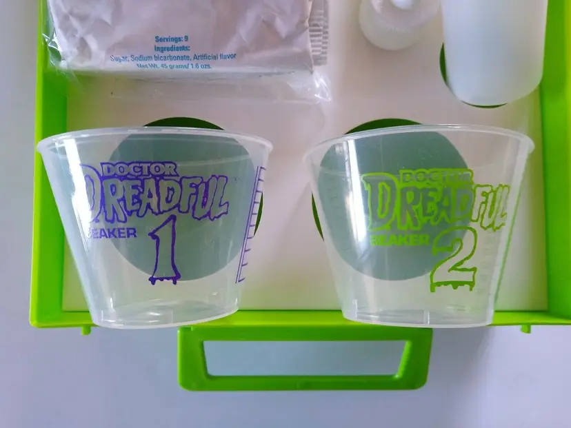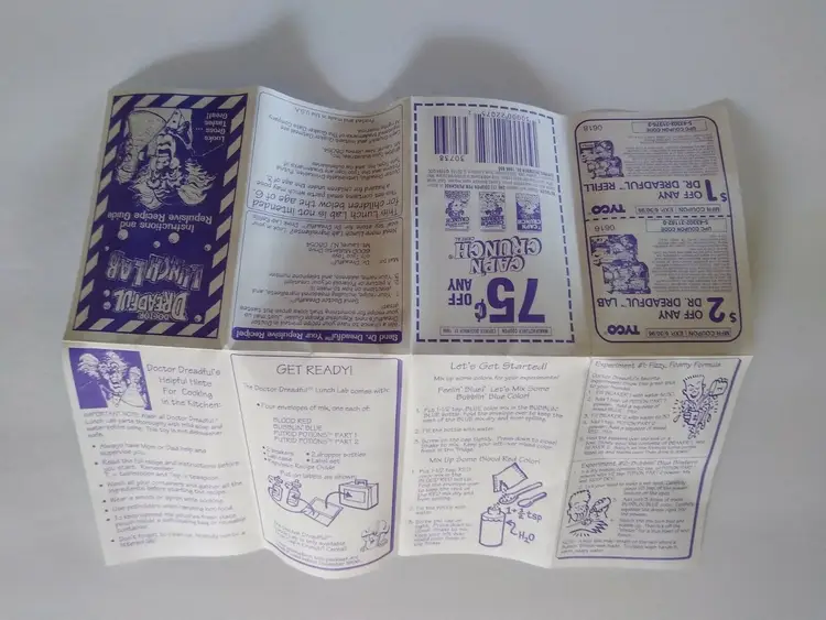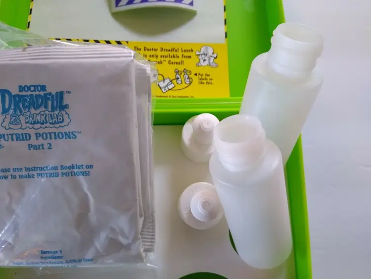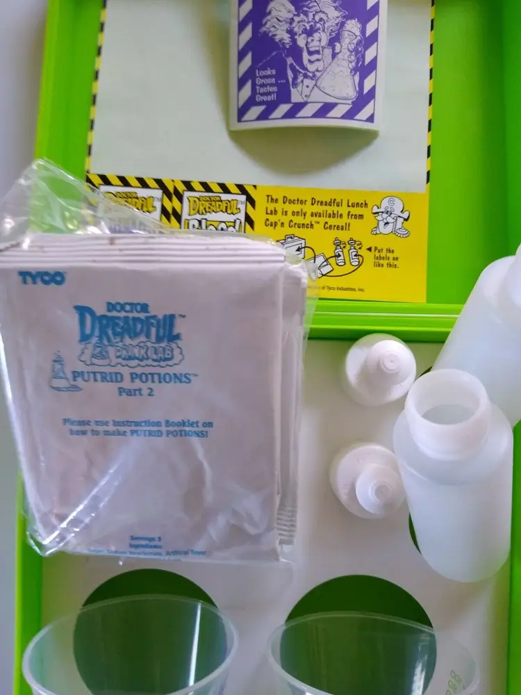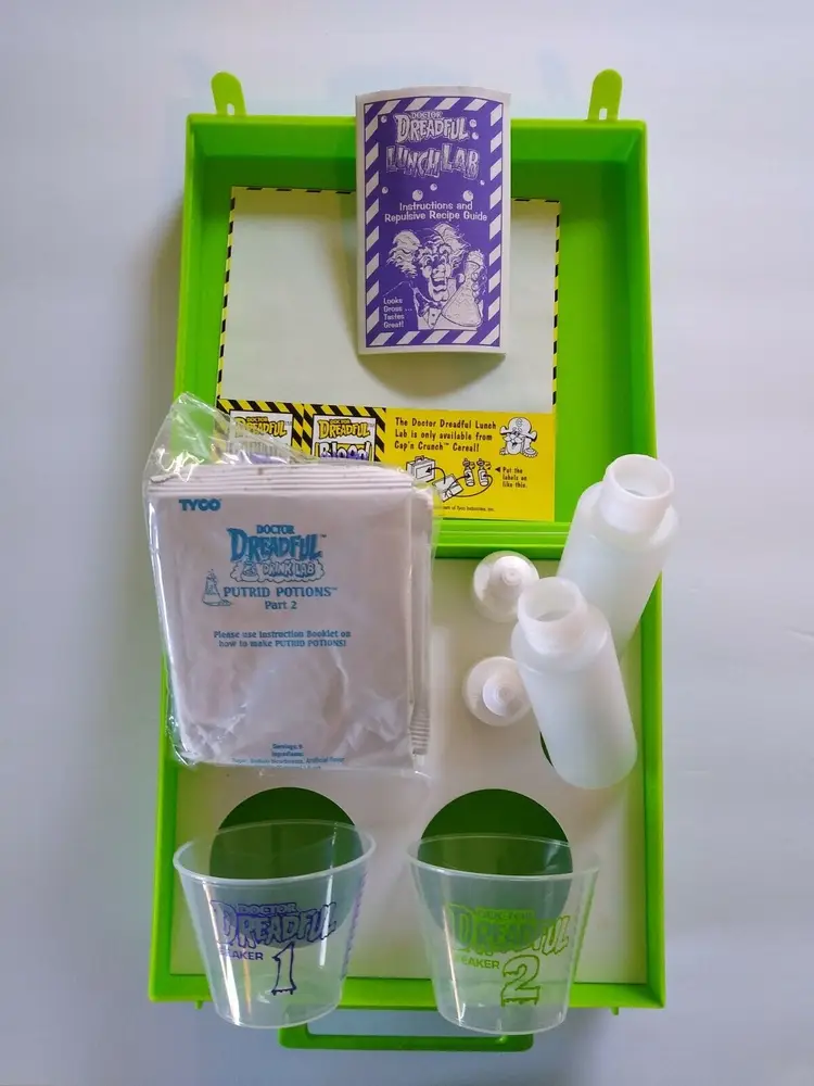 Doctor Dreadful Lunch Box or Lunch Lab. New old stock vintage item. Tyco is printed on the front graphic decal. Full contents and never used. A promo item from Cap'n Crunch cereal back in 1994. Complete with green plastic box, 4 packets of the putrid potions, instruction recipe guide booklet, extra decals, two plastic bottles with toppers, and two plastic beaker cups title #1 and #2. The plastic box latches do not close very well due to the poor design. Size of box is 7.5" x 6.5" x 3.25".This item is sold as a collectible item and not for consumption. Modified Item: No Country/Region of Manufacture: United States Material: Plastic Brand: Tyco Time Period Manufactured: 1970-Now