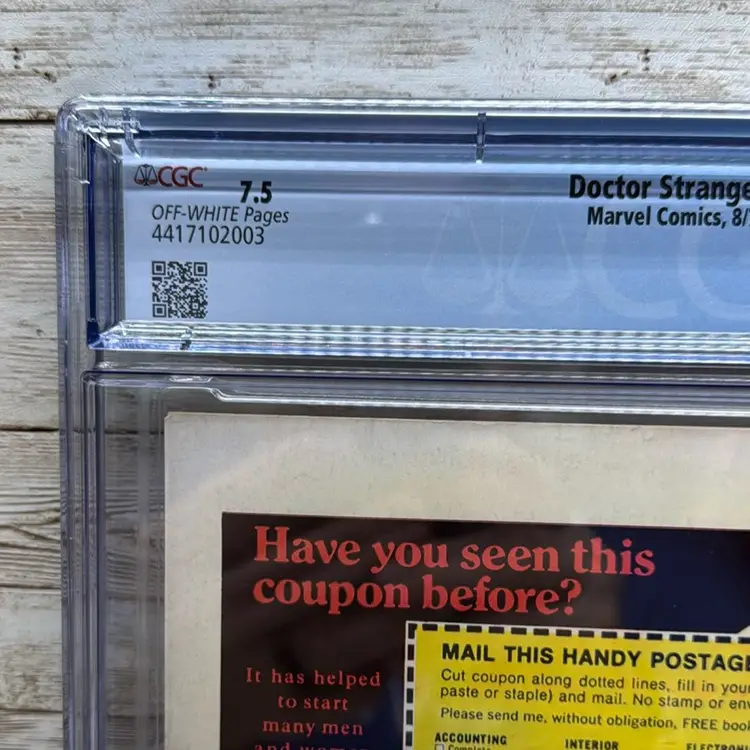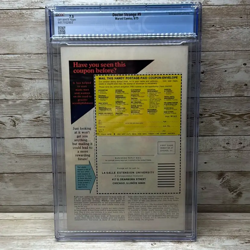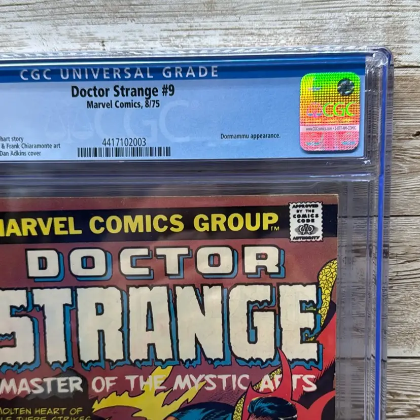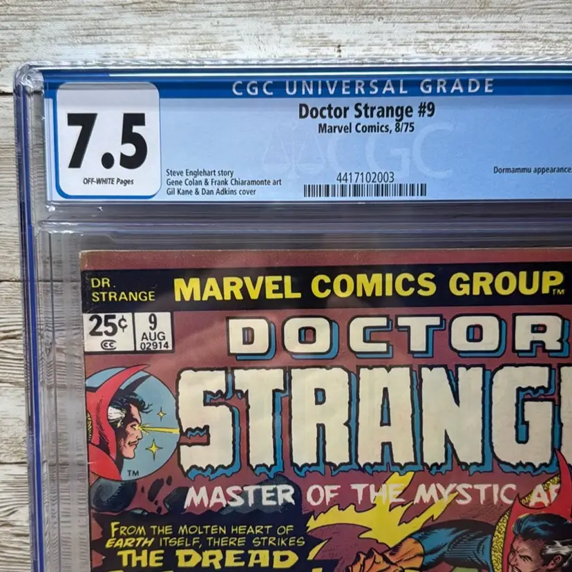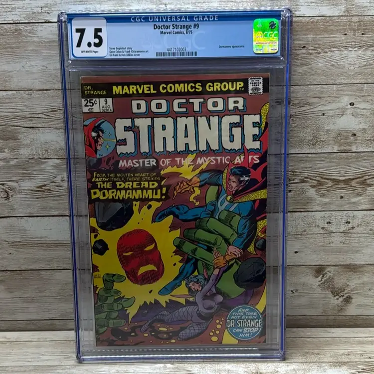 This is Doctor Strange #9, published by Marvel Comics in August 1975, featuring a significant Dormammu appearance. In this issue, Doctor Strange confronts Dormammu in a pivotal storyline that delves into the origins of Clea and her connection to the Dark Dimension. The comic is graded CGC 7.5, indicating a Very Fine Minus (VF-) condition with minor wear and well-preserved cover colors.