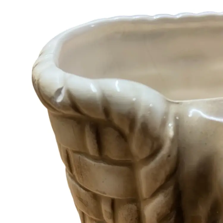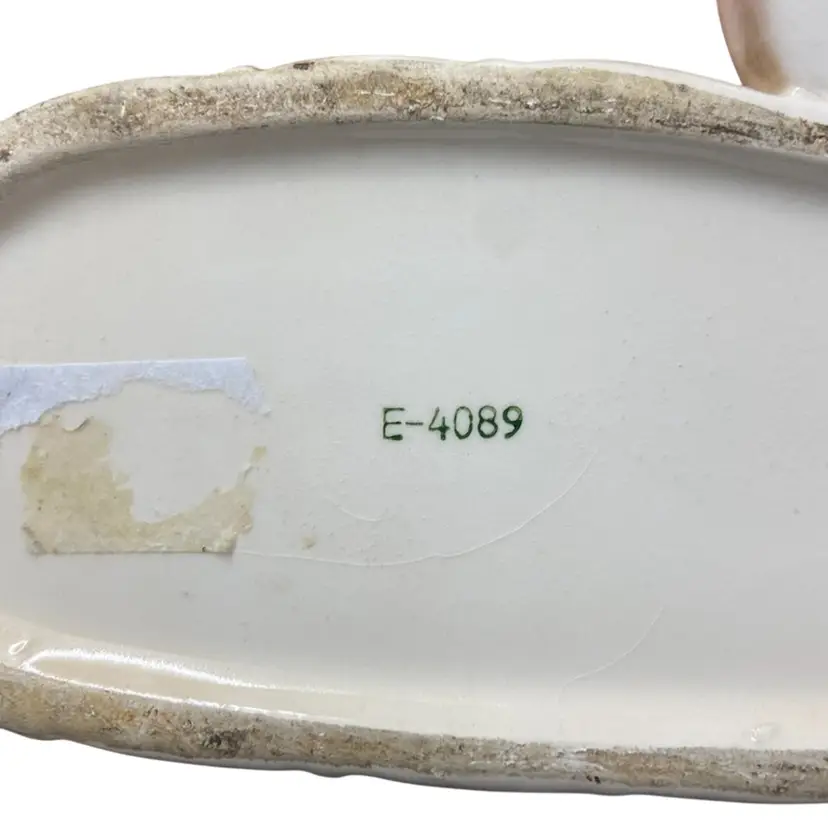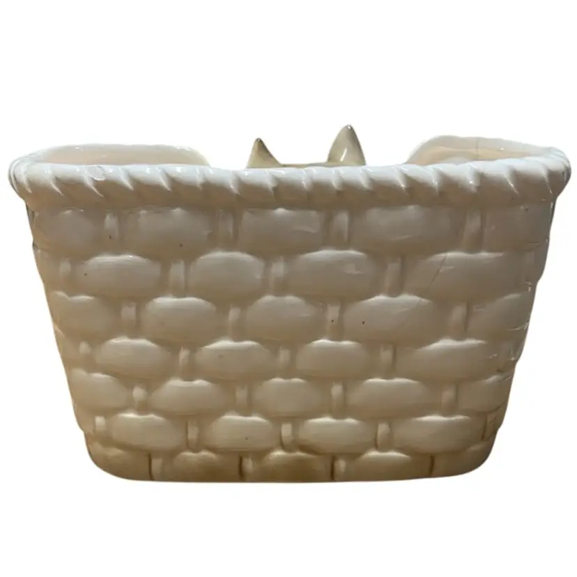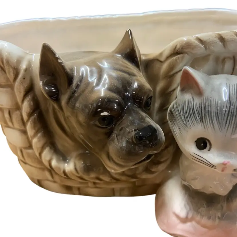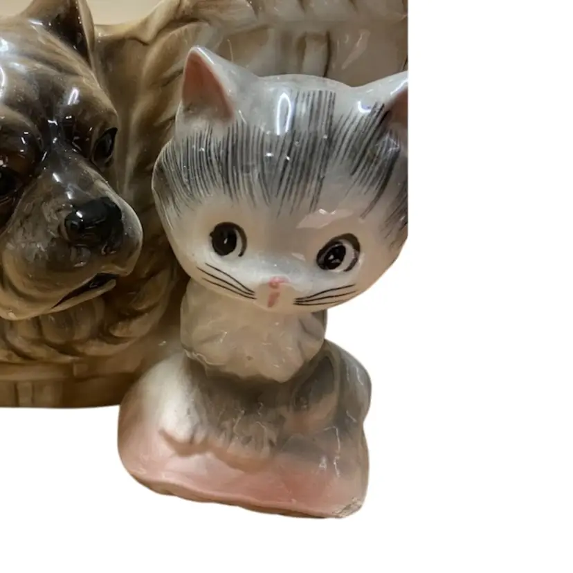 Vintage planter with dog & kitten. Unsure of maker as sticker is gone but is numbered. Approximately 4” T x 6” W. Minor paint loss and 2 small chips as noted in pictures.