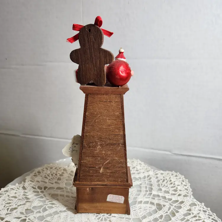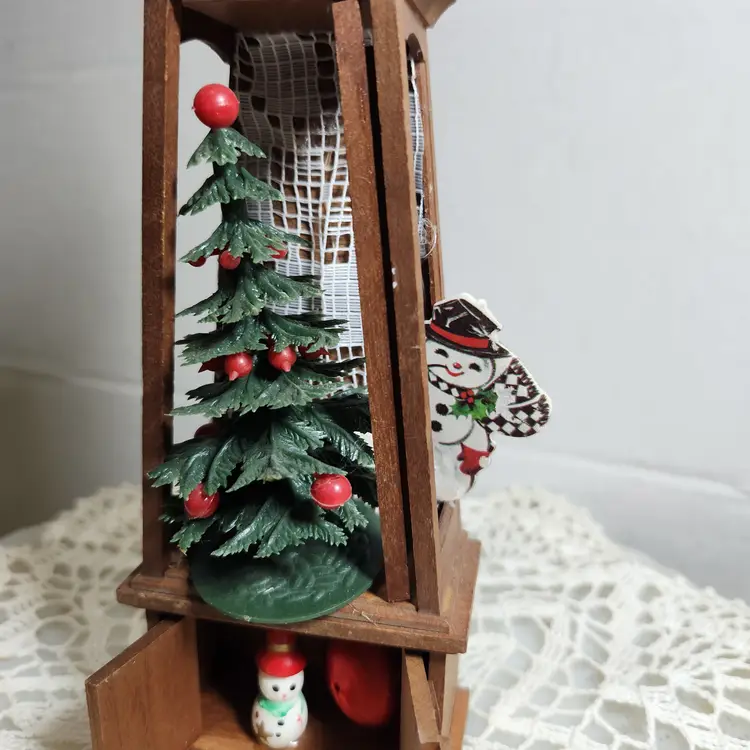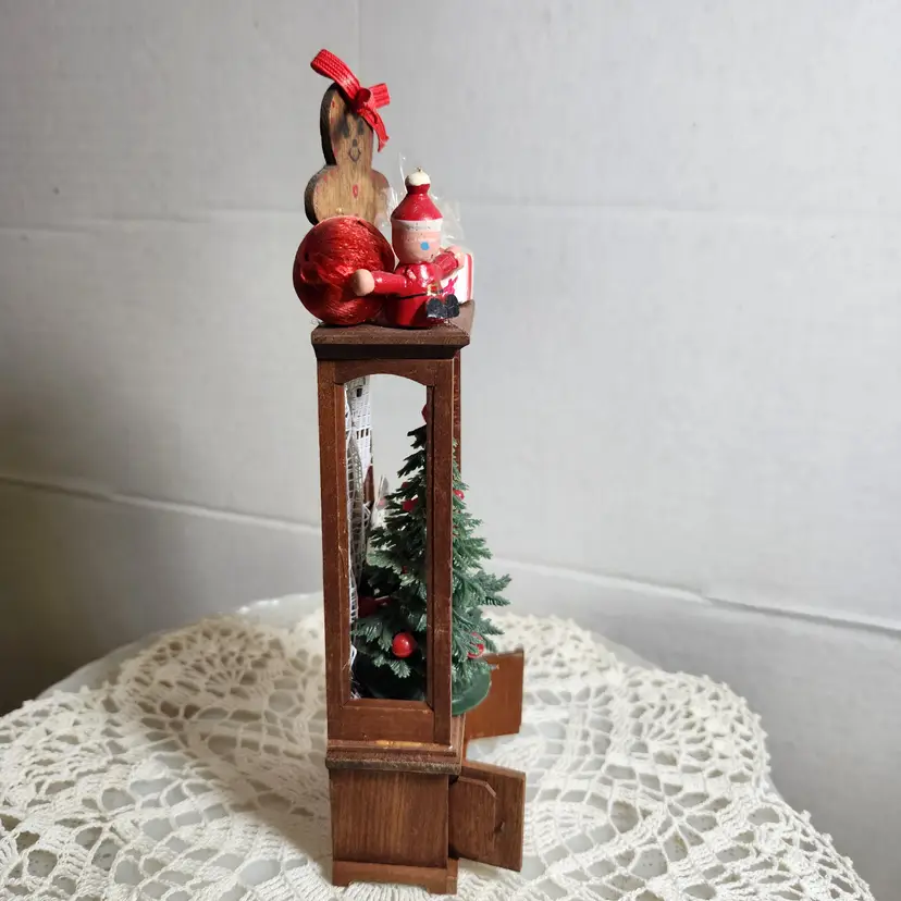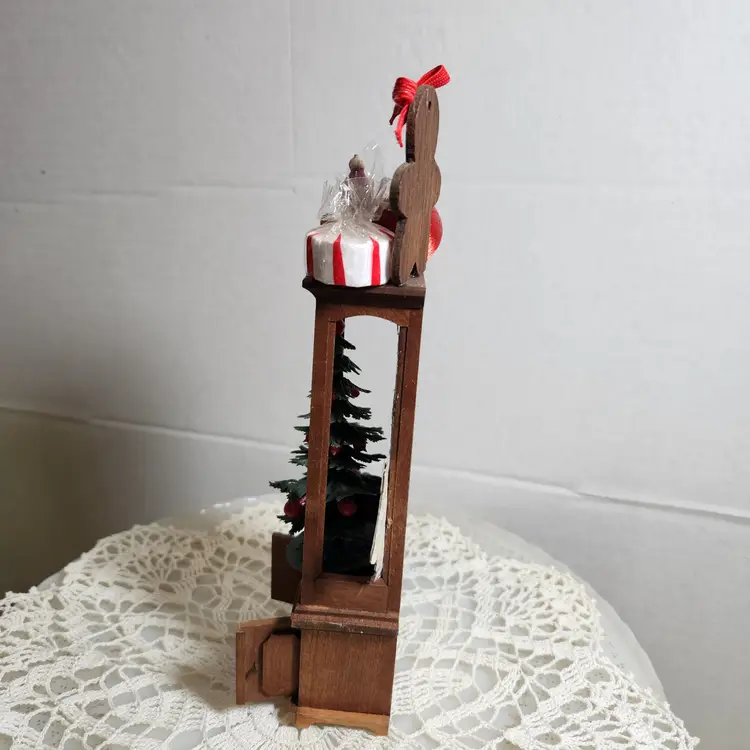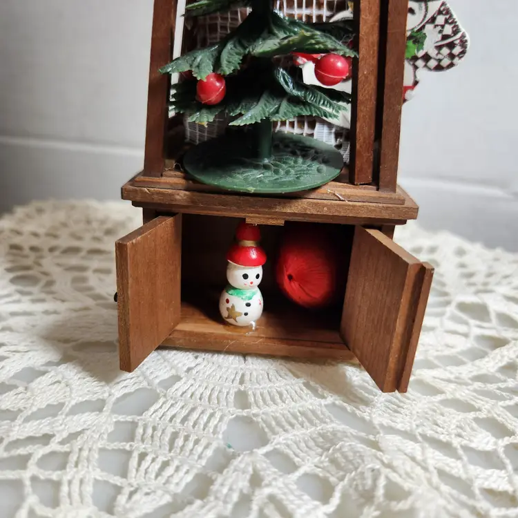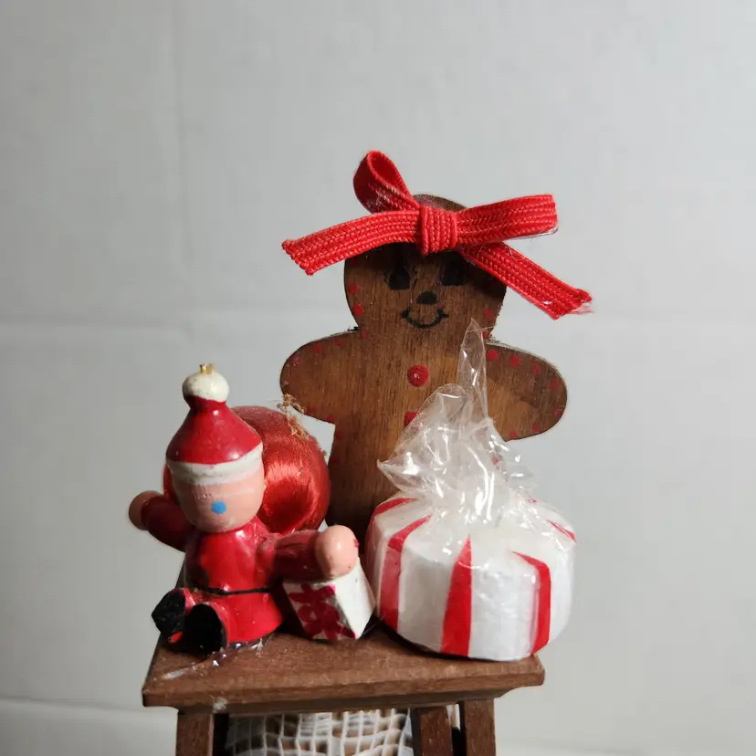 A piece of doll house furniture turned Christmas decor. Filled to bursting with a Christmas tree and gifts tucked into every nook and cranny.
