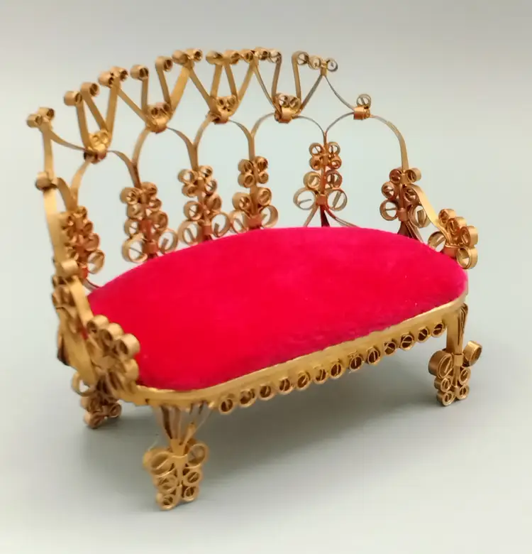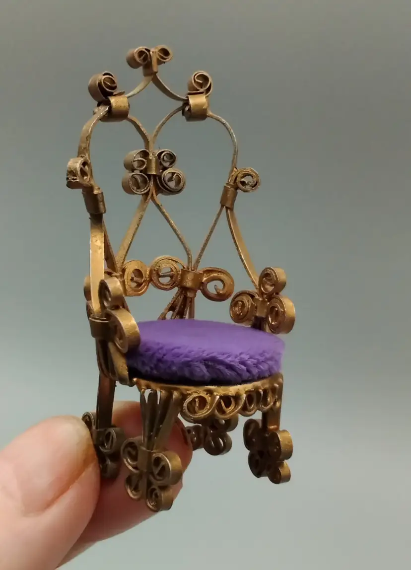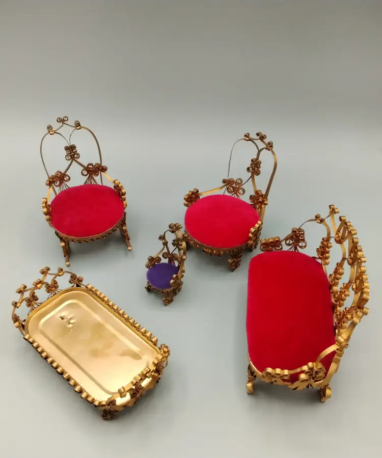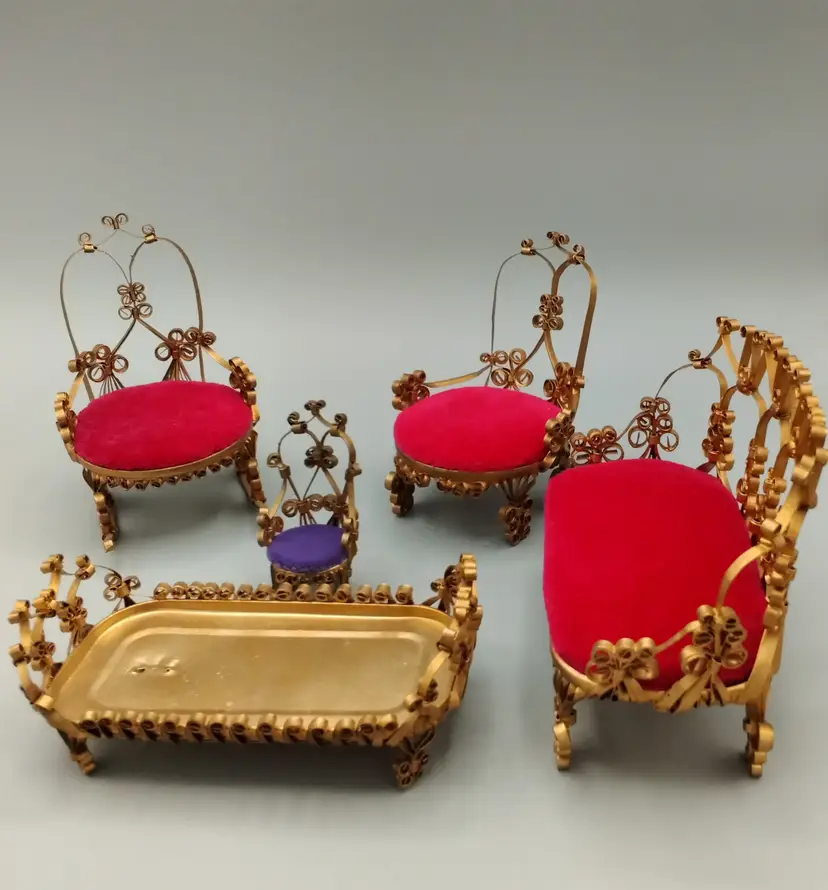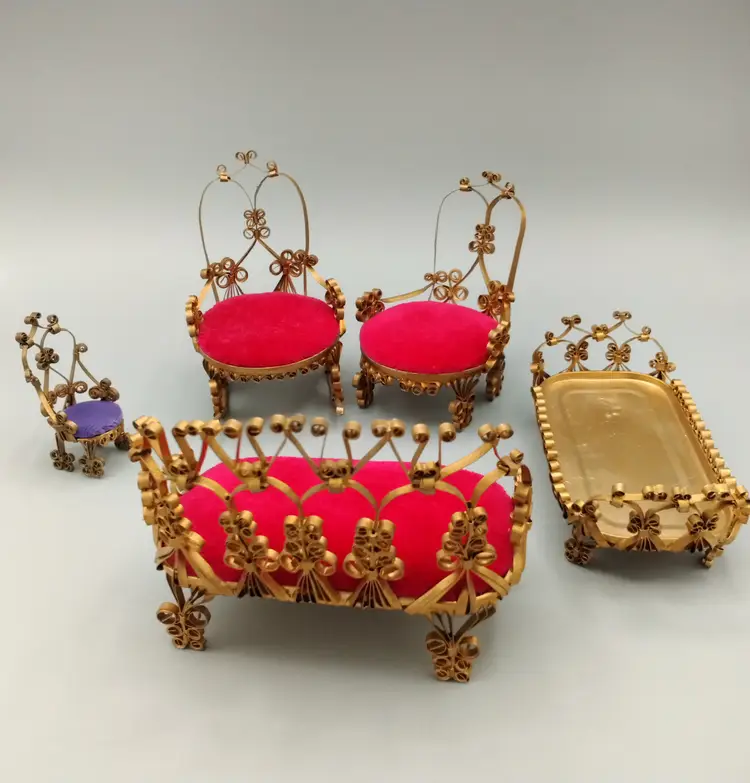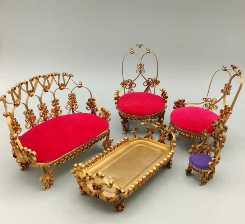 Doll Furniture, Tramp Art, Tin Can Doll House Furniture, Barbie Doll Furniture. These pieces of Doll house furniture are handcrafted using recycled tin cans. They are carefully cut up and pieces are twirled and twisted in ornate designs. They are spray painted, and cushions are made. This set also includes a tiny chair with a purple cushion. It is an exact in design and would make a cute child's chair, or a toy Teddy can sit in it.
