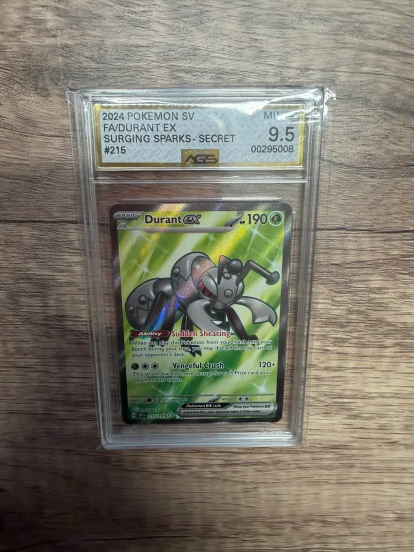 Up for sale is a 2024 Pokémon Scarlet & Violet Durant ex Secret Rare from the Surging Sparks set, professionally graded and encapsulated. Card Details: Pokémon: Durant ex Set: Surging Sparks (SV) Card Number: #215 (Secret Rare) Year: 2024 Grading Company: AGS Grade: 9.5 Mint Certification #: 00295008 Condition: Graded & sealed in AGS slab Why this card stands out: High-grade AGS 9.5, close to Gem Mint Secret Rare card with strong collector demand Secure, tamper-proof slab for long-term protection Great addition for collectors or competitive Pokémon investors You will receive the exact card shown in the photos. Card will be shipped securely and protected to ensure safe delivery.
