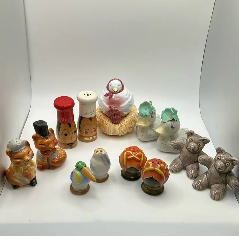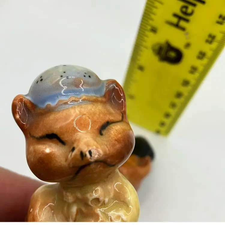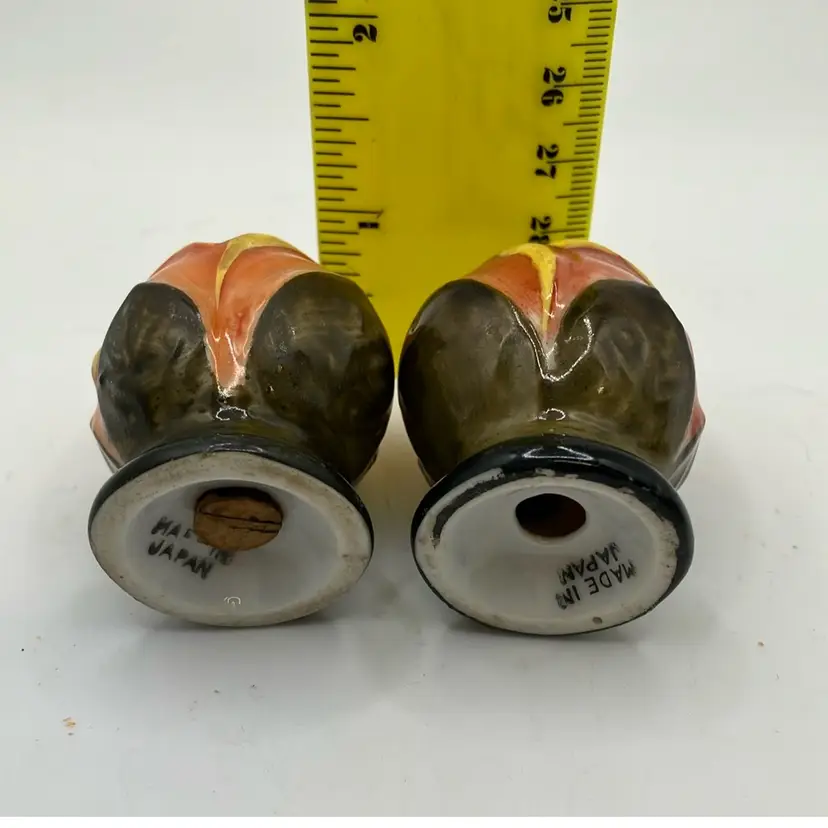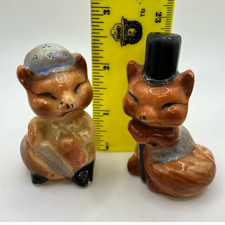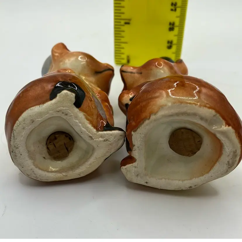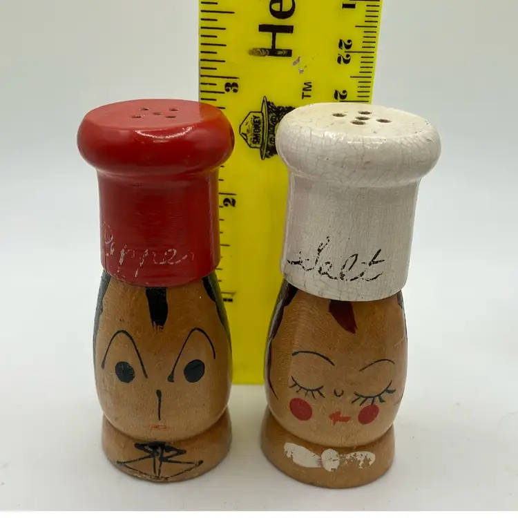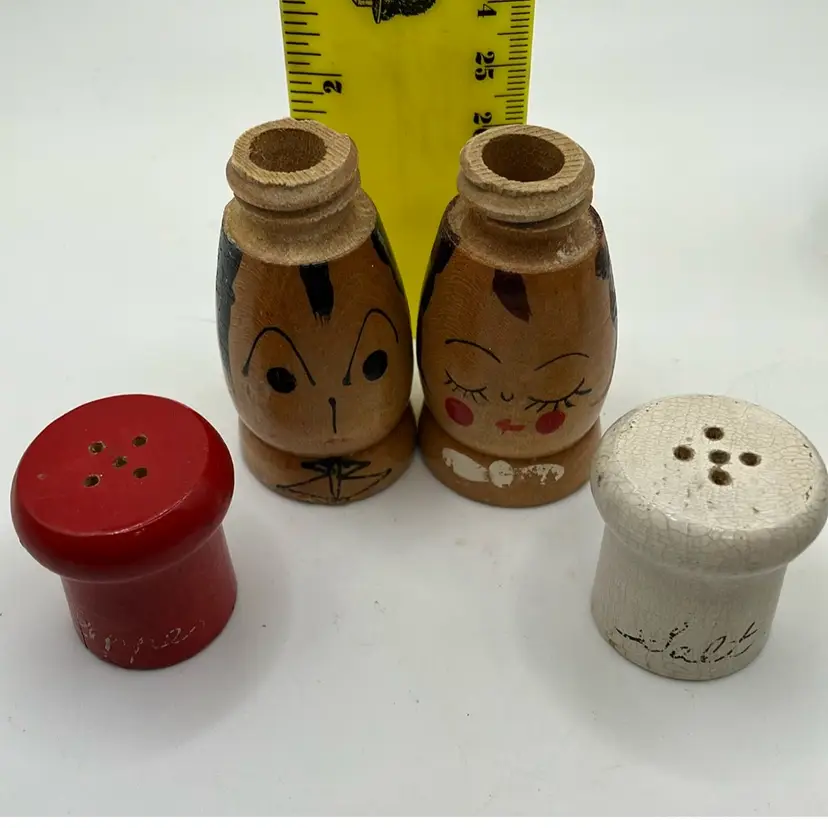 *Fancy Fox and his Fox Lady- both have cork stoppers. No markings. Lady has tiny chip on nose *Wood chefs- have to paint loss, no markings. Hats screw off