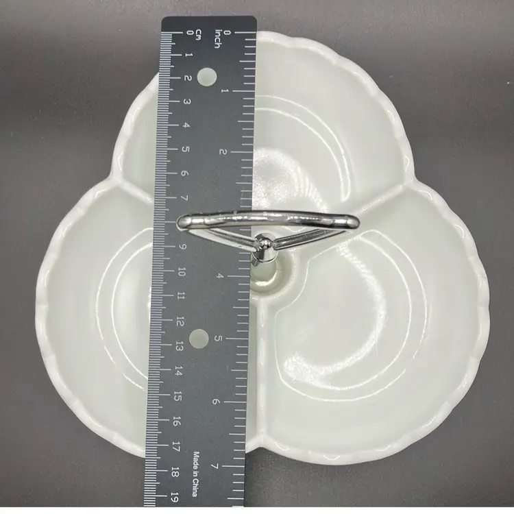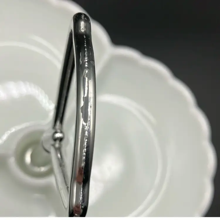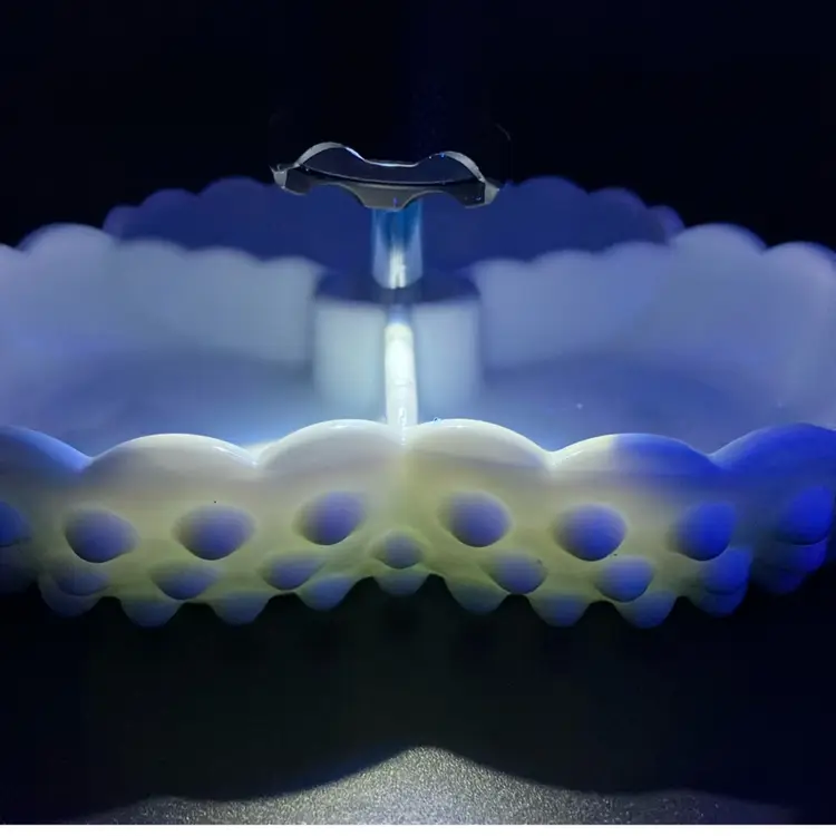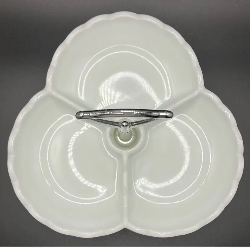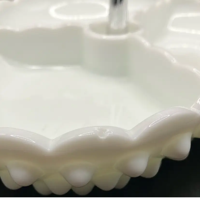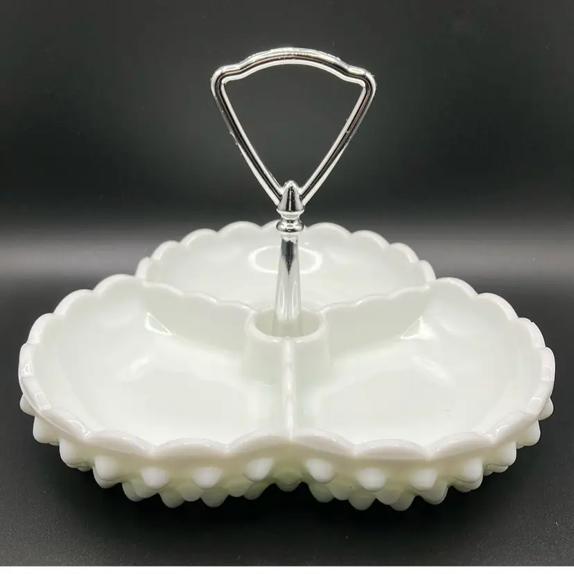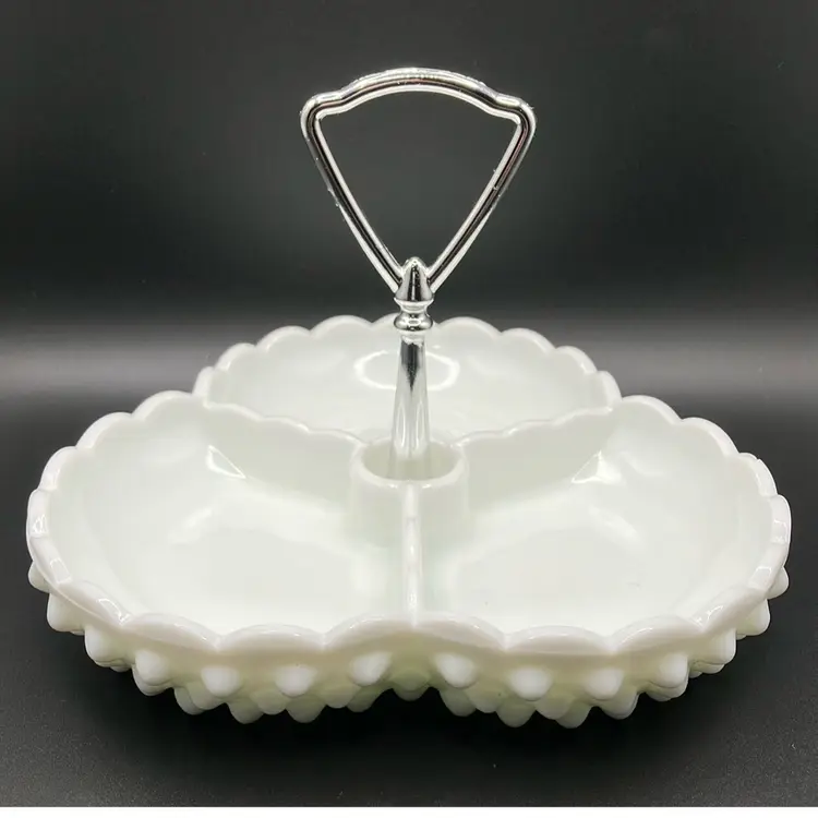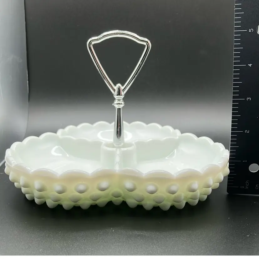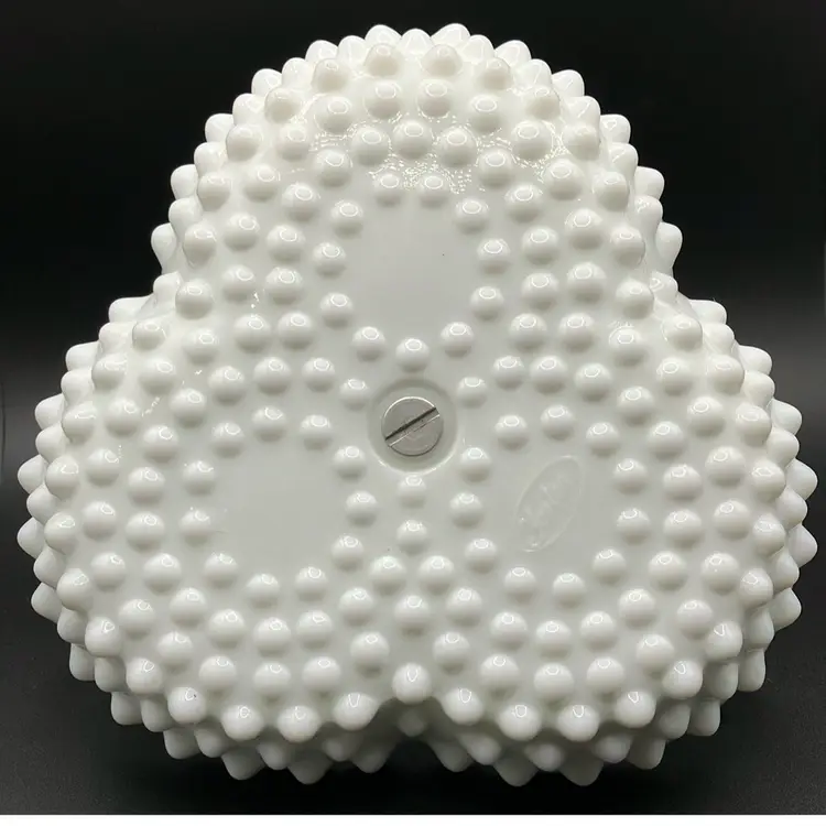 Good condition - slight wear on one spot on top of handle and one tiny chip on edge. (See pics) Marked Fenton on bottom. Does have some glow. Solid piece that can be used in a variety of ways.